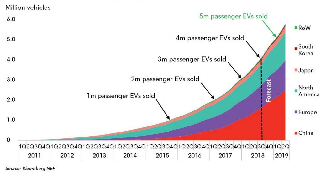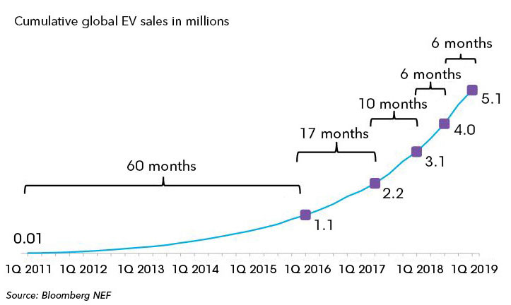 Während es noch 60 Monate brauchte, bis die erste Million an Elektroautos erreicht wurde, so waren es für die nächste Million nur mehr 17 Monate, dann 10 Monate und von 3 auf 4 Millionen nur mehr 6 Monate. Es wird erwartet, dass die 5. Million an verkauften Elektroautos Im März 2019 innerhalb von 6 Monaten erreicht wird.