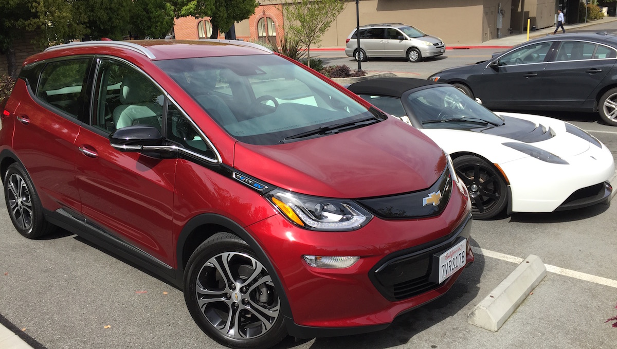 Hier sind erste Bilder des neuen Chevrolet Bolt in freier Wildbahn. Entdeckt habe ich das Bordeux-rote Elektrofahrzeug in Los Altos vor meinem Stammcafé. Gleich daneben geparkt war ein Tesla Roadster. Das Café selbst ist ein Anziehungspunkt für Elektrofahrzeuge, da sich dort gleich zwei Ladestationen mit vier Ladepunkten befinden, und der Strom gratis getankt werden kann.