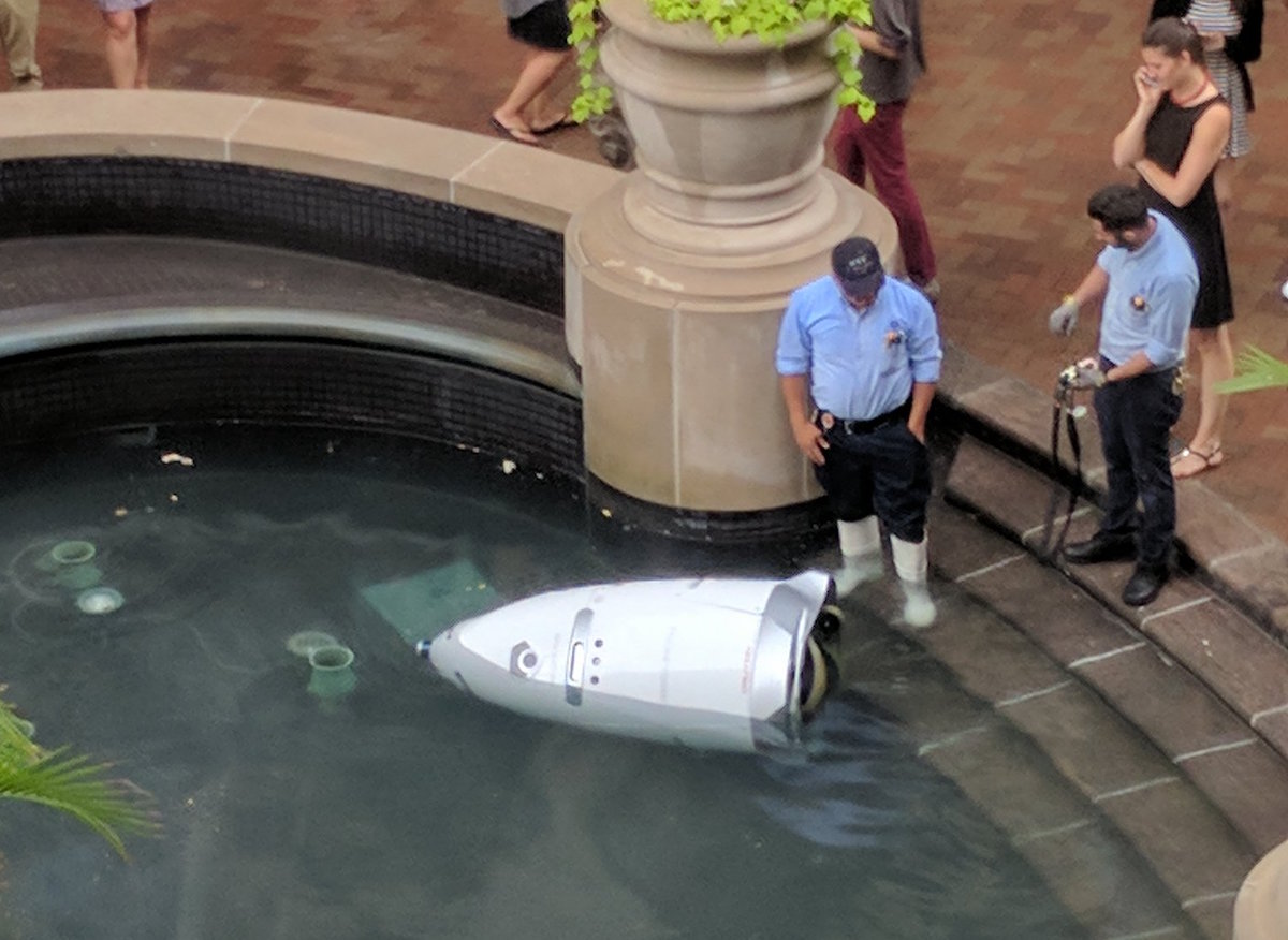 Auf dem von Foto von Bilal Farooqui, dem Gründer der Gesundheitsfirma CrystalMD, sah man den Knightscope K5 halb untergegangen wie er scheinbar die Stufen ins Wasser hinabgestürzt war.