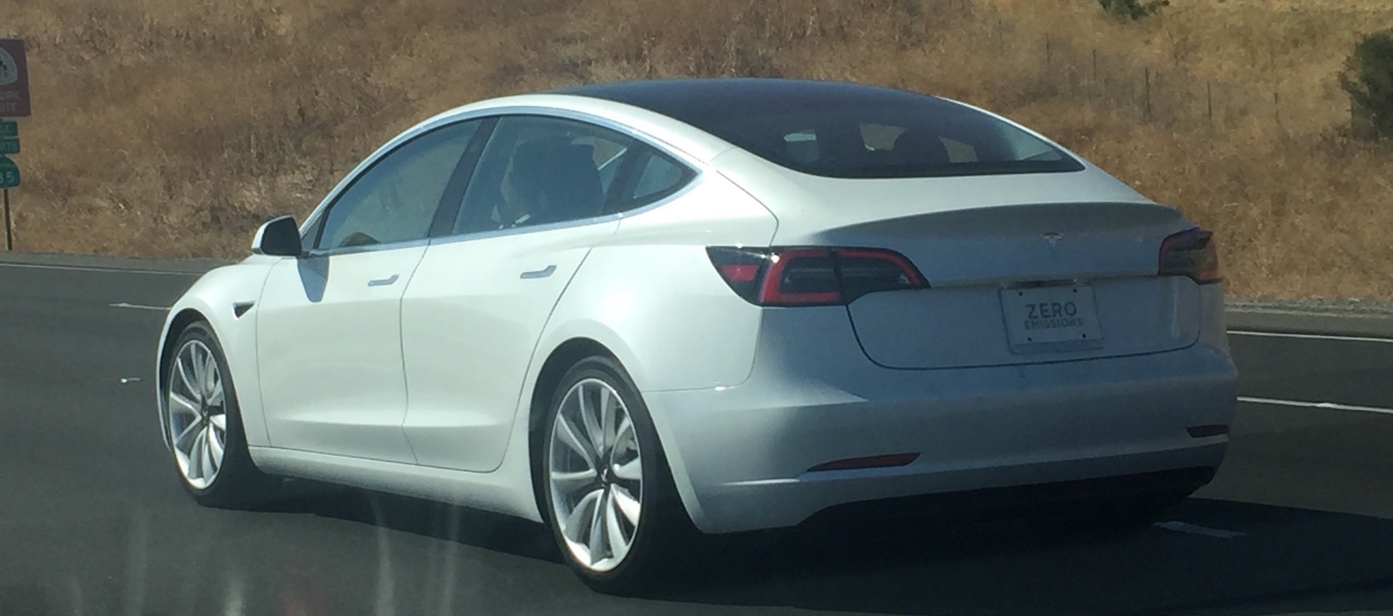 Nach einigen Vorserienfahrzeugen gelang es mir nun zum ersten Mal ein Model 3 aus der Serienproduktion in freier Wildbahn nicht nur selbst zu sehen, sondern es auch zu fotografieren. Das weiße Fahrzeug war am 6. August 2017 noch ohne Kennzeichen mit vier Passagieren auf dem Highway 101 Richtung Norden etwa fünf Meilen südlich von San José unterwegs.