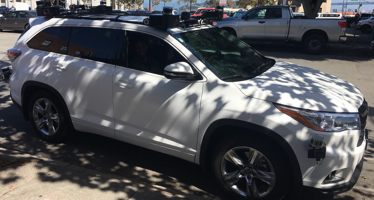 Unser Leser René Felder hat dieses autonome Testfahrzeug in vor zwei Wochen in San Francisco in der Nähe der Fisherman’s Wharf entdeckt. Die Insassen erwiderten auf die Frage, welches Unternehmen das sei mit „Das dürfen wir nicht sagen.“
