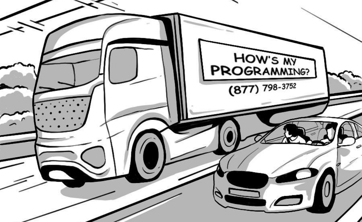 Eine Eigenheit die man auf amerikanischen Straßen finden kann sind diese Aufkleber auf kommerziellen Lastwagen oder Limousinenservices. Auf ihnen steht: „How’s my driving?“ („Wie ist mein Fahrstil?“) ergänzt durch eine Telefonnummer. Auf Wikipedia beschäftigt sich ein ganzer Eintrag damit, was er bedeutet. Kurz: der Sticker befindet sich zumeist auf kommerziellen Fahrzeugen die von Angestellten gefahren werden. Die Öffentlichkeit ist eingeladen, schlechtes (oder gutes) Fahrverhalten und Benehmen der Fahrer an den Arbeitgeber zu melden.
