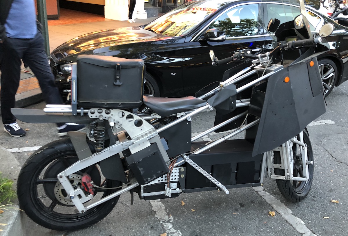 Dieses elektrische Motorrad der Marke Eigenbau sah ich heute Abend in Palo Alto auf der University Avenue vor dem Stanford Theatre geparkt. Mit drei Batterieboxen auf ganz tief gesenktem Schwerpunkt und Verkleidung stand es da.