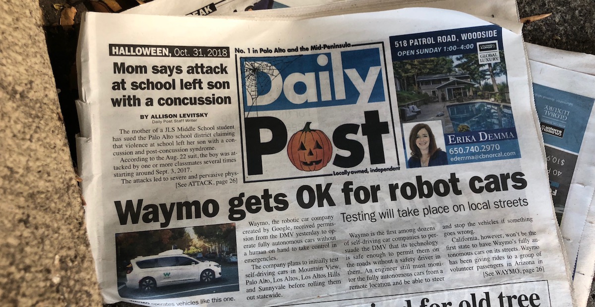 Im Silicon Valley haben die lokalen Zeitungen nicht nur Schlagzeilen zu den ganzen technologischen Tests von autonomen Autos, sondern Politiker müssen auch bereits eine Meinung zu dieser Technologie haben. So sind die Kandidaten für die aktuellen Wahlen am 6. November mit ihren Standpunkten zu autonomen Autos befragt worden.