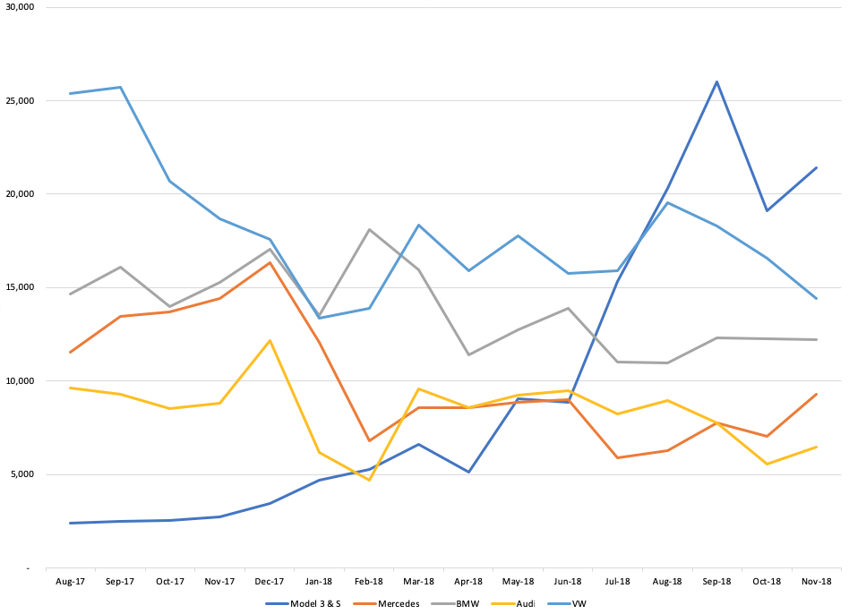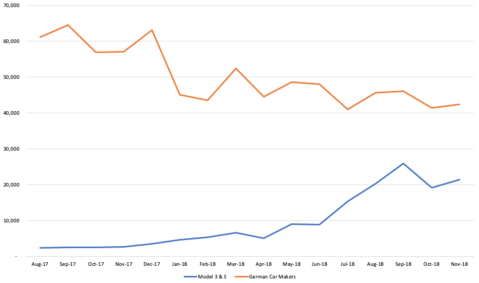 Die Verkaufszahlen deutsche Marken sind seit der Einführung des Model 3 im Sommer auf niedrigem Niveau gleichbleibend. Und liegen damit einzeln unter den Verkäufen von Tesla.