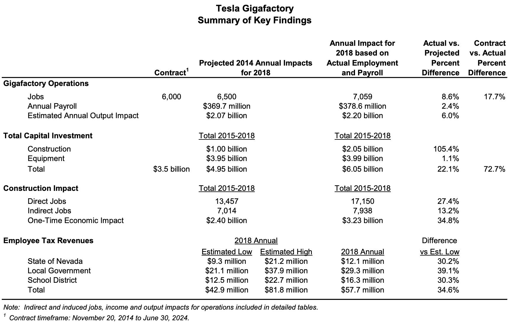 Das Wirtschaftsbüro des Gouverneur von Nevada spricht in einem Bericht von einer erfolgreichen Betriebsansiedelung. So wurden bislang 7.000 Arbeitsplätze durch die Gigafactory geschaffen und das wirtschaftliche Umfeld hat sich permanent geändert. Tesla hat die Erwartungen des Bundesstaates in allen Kennzahlen übertroffen, und 6 Milliarden Dollar wurden von Tesla und Partnerunternehmen in die Region investiert.