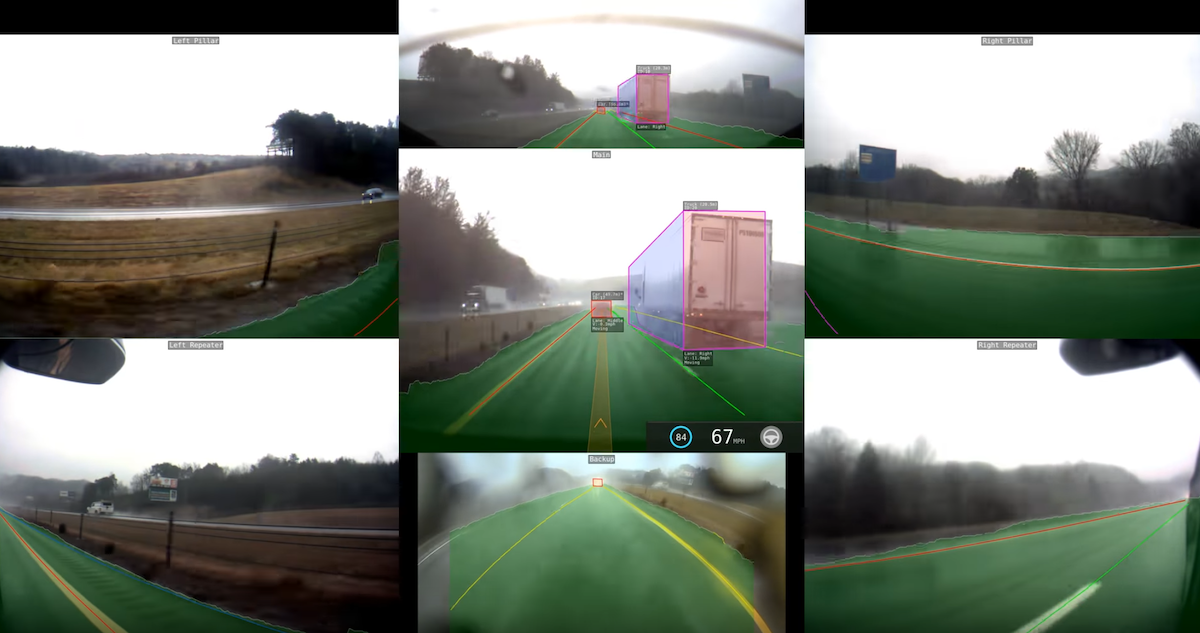 Hier ist ein Beispiel, wie der Tesla Autopilot – ein Fahrerassistenzsystem – in der Firmware-Version 18.48.12.1 von Regen beeinflußt wird und wie Objekte erkannt werden. Das Video inkludiert sieben der acht Kameras.
