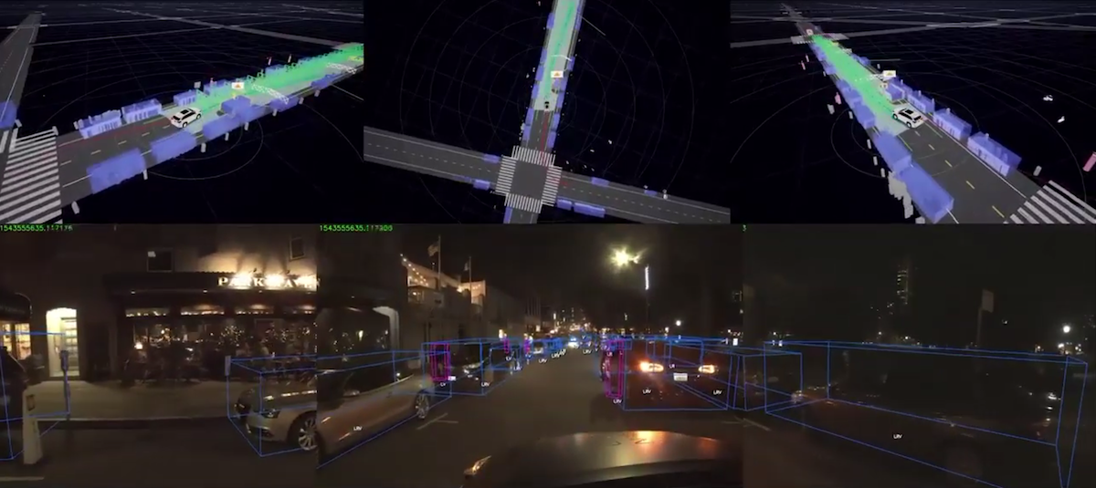 Der zweite Beitrag von Zoox zeigt gleich sechs solcher Situationen mit Liefer- und Müllwagen. Interessant hier ist was das Fahrzeug erkennt und kategorisiert, und in einem Beispiel wie es die Absicht eines zweiten Fahrzeugs erkennt, das ihm den Vortritt läßt.