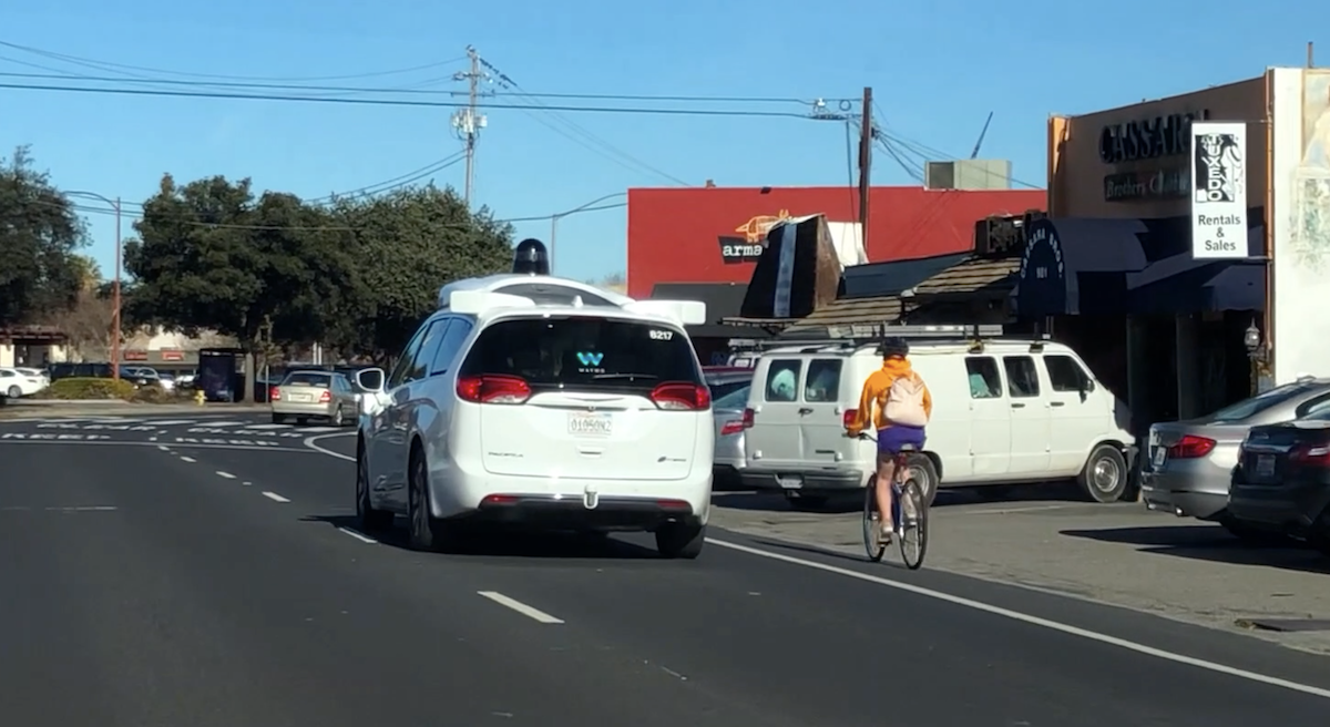 Kurz danach erkennt man auf der rechten Seite einen Fahrradfahrer, den das Waymo auch sieht und für ihn abbremst und die Geschwindigkeit verringert um sicher vorbeizufahren. Wie man sehen kann ändert das Waymo allerdings nicht den Abstand, sondern bleibt mehr oder weniger in der Mitte seiner Fahrspur.