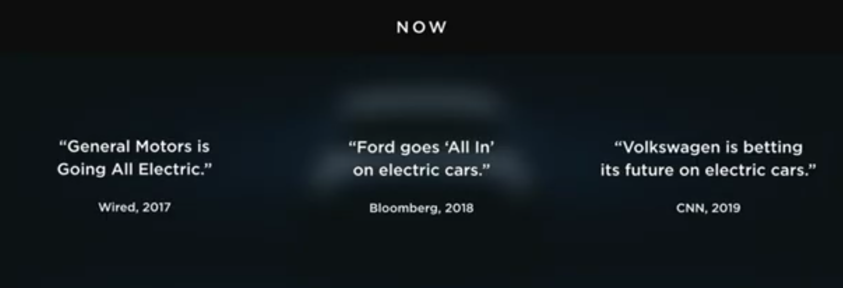 Musk zitierte auch die Medien von vor 10 Jahren und heute, und der Unterschied ist dramatisch. Der Skepsis von damals folgen nun Reihen von Ankündigungen anderer Automobilhersteller. Musk meinte dazu, dass der Erfolg von Tesla auch daran gemessen werden sollte, wie die gesamte Industrie sich nun in dieselbe Richtung bewegt.