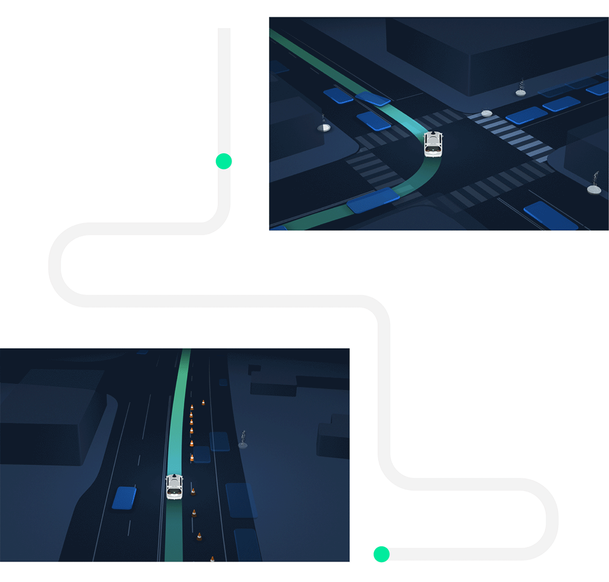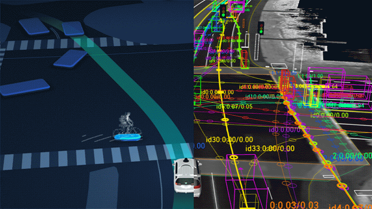 Einiges Kopfzerbrechen bereitete den Designer allerdings die Frage nach wie viel Informationen den Passagieren auf den im Fahrzeug montierten Bildschirmen zur Fahrt anzuzeigen ist. Auf den kleinen Monitoren können die Insassen mitverfolgen, was das Fahrzeug sieht und wohin es geht. Nicht immer ist alle Information notwendig, immerhin generieren die Fahrzeugsensoren Unmengen an Daten und überlagern das auf die digitalen Straßenkarten. Hier ist ein Beispiel wie das Bild für das Fahrzeug und jenes für die Passagiere aussieht. Man erkennt rasch, dass den Passagieren mitgeteilt wird, dass das Fahrzeug die wichtigsten Objekte wie eben beispielsweise andere Verkehrsteilnehmer im Blickfeld hat und entsprechend reagiert.