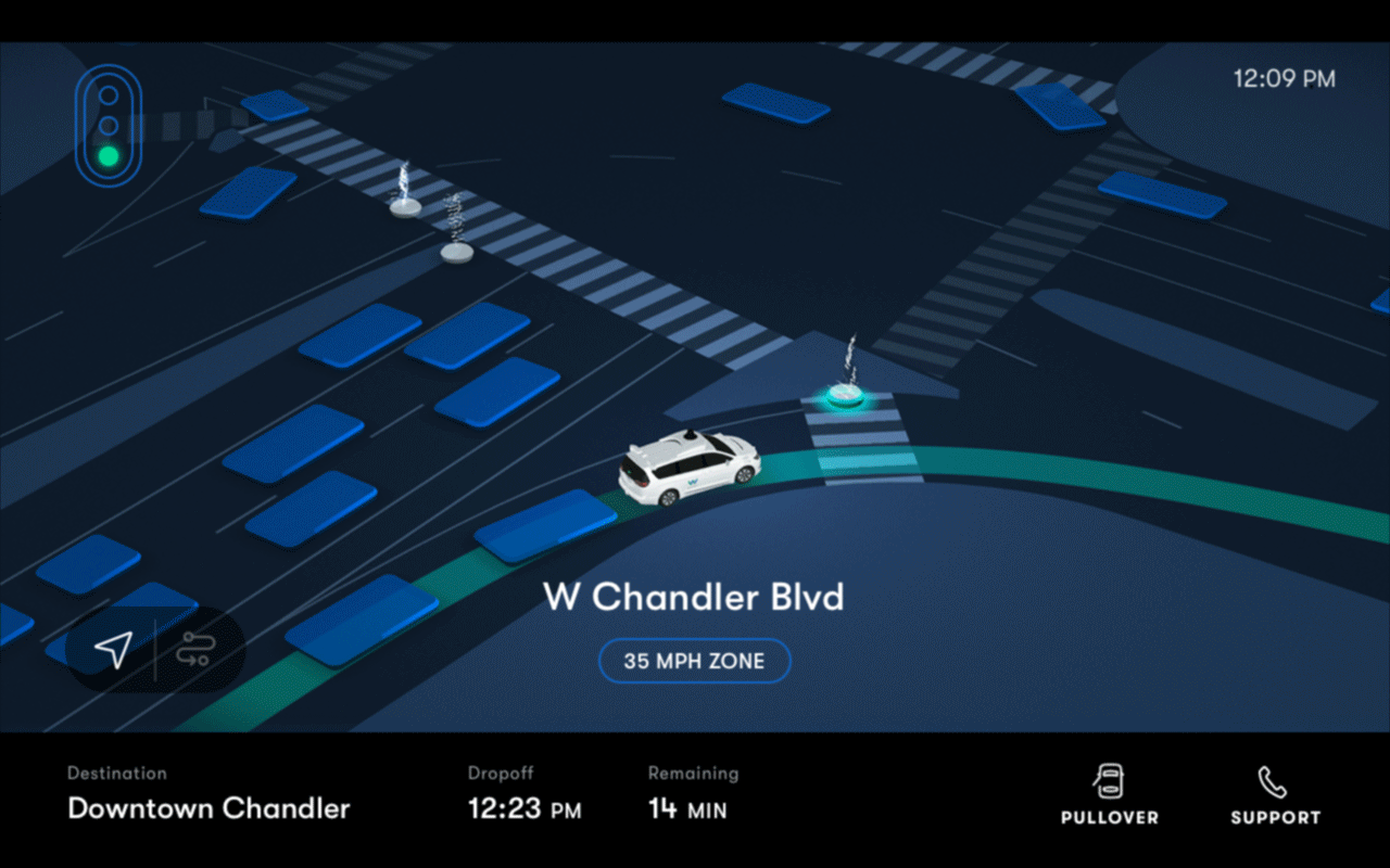 Ryan Powell, Designer bei Google, veröffentlichte einen Blog in dem er auf die verschiedenen vertrauensbildenden Maßnahmen für Passagier eingeht. Die App mit der man ein Waymo One bestellt zeigt bereits den Pfad an, den das Fahrzeug zur Abholung der Passagiere nehmen wird. Und dieser Weg mag nicht immer geradlinig sein, weil die Zufahrt des Fahrzeugs ja auch gesetzestreu und sicher erfolgen soll.