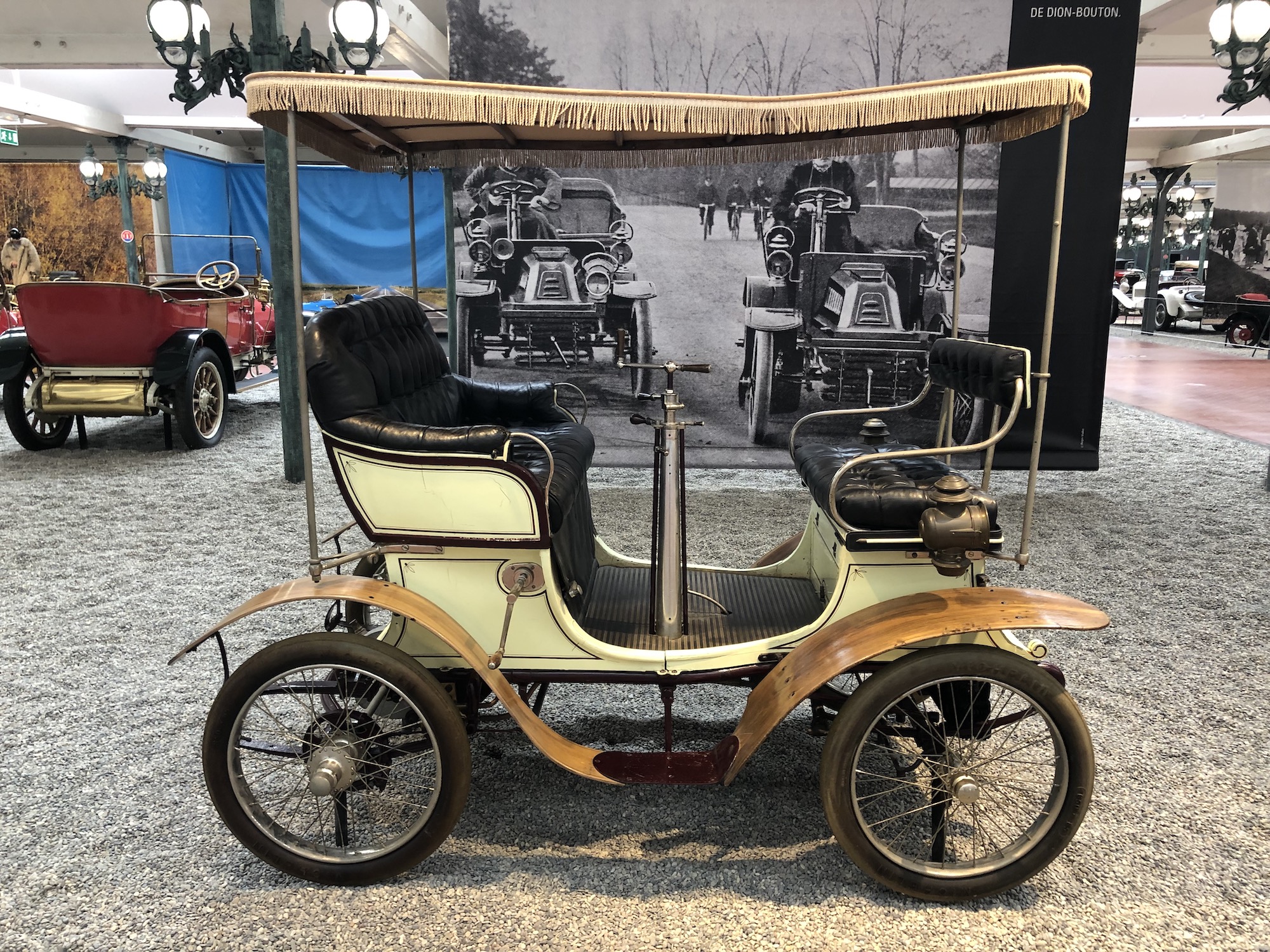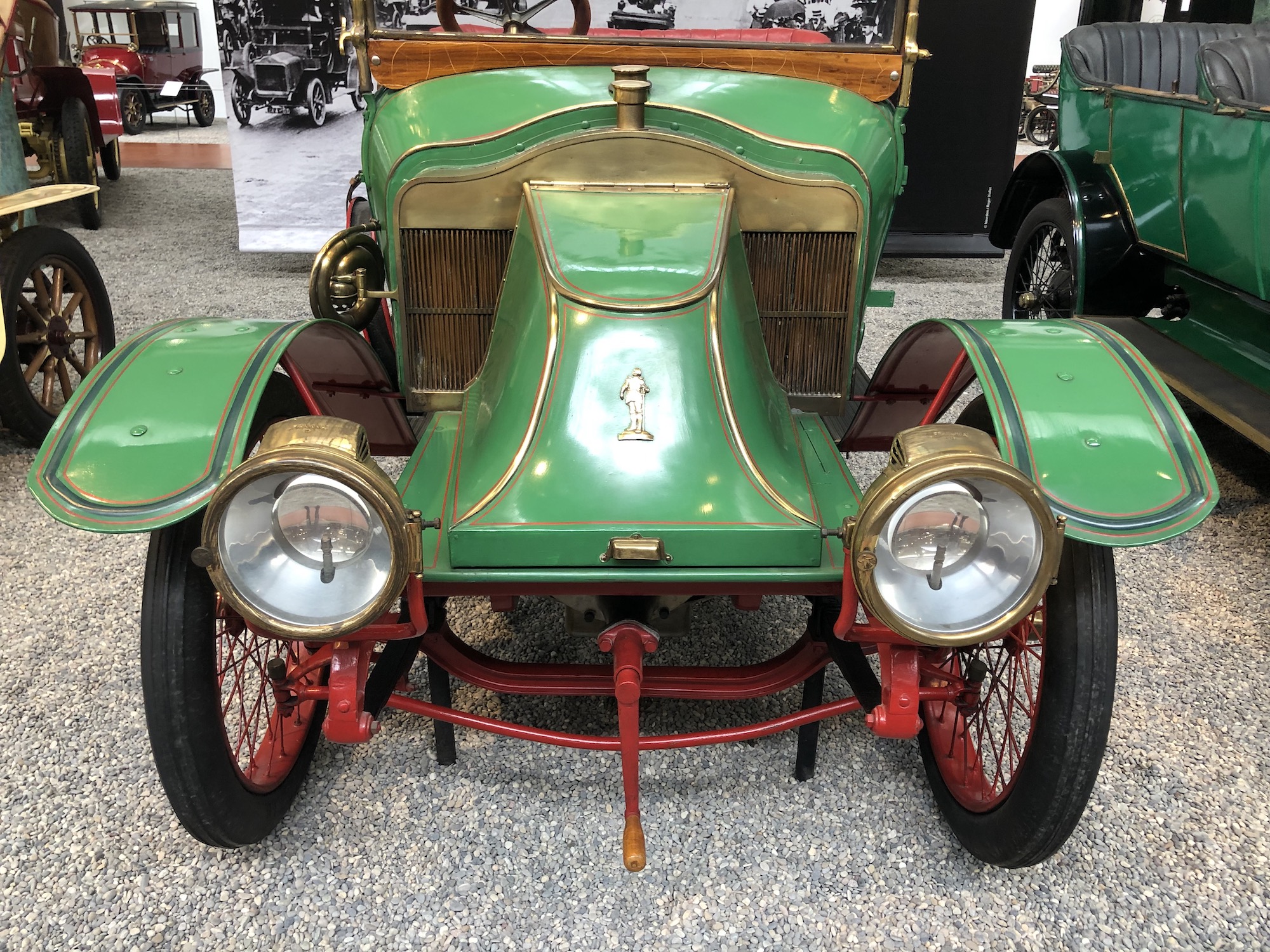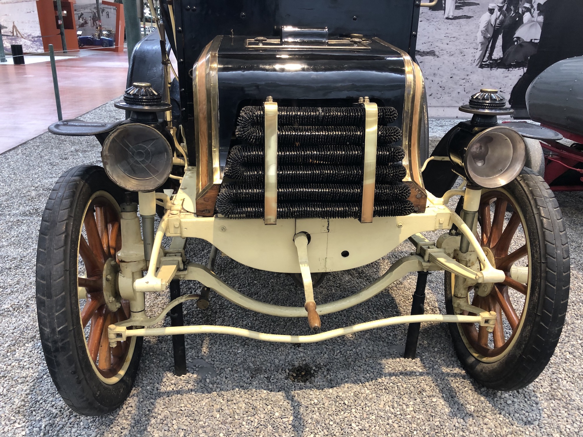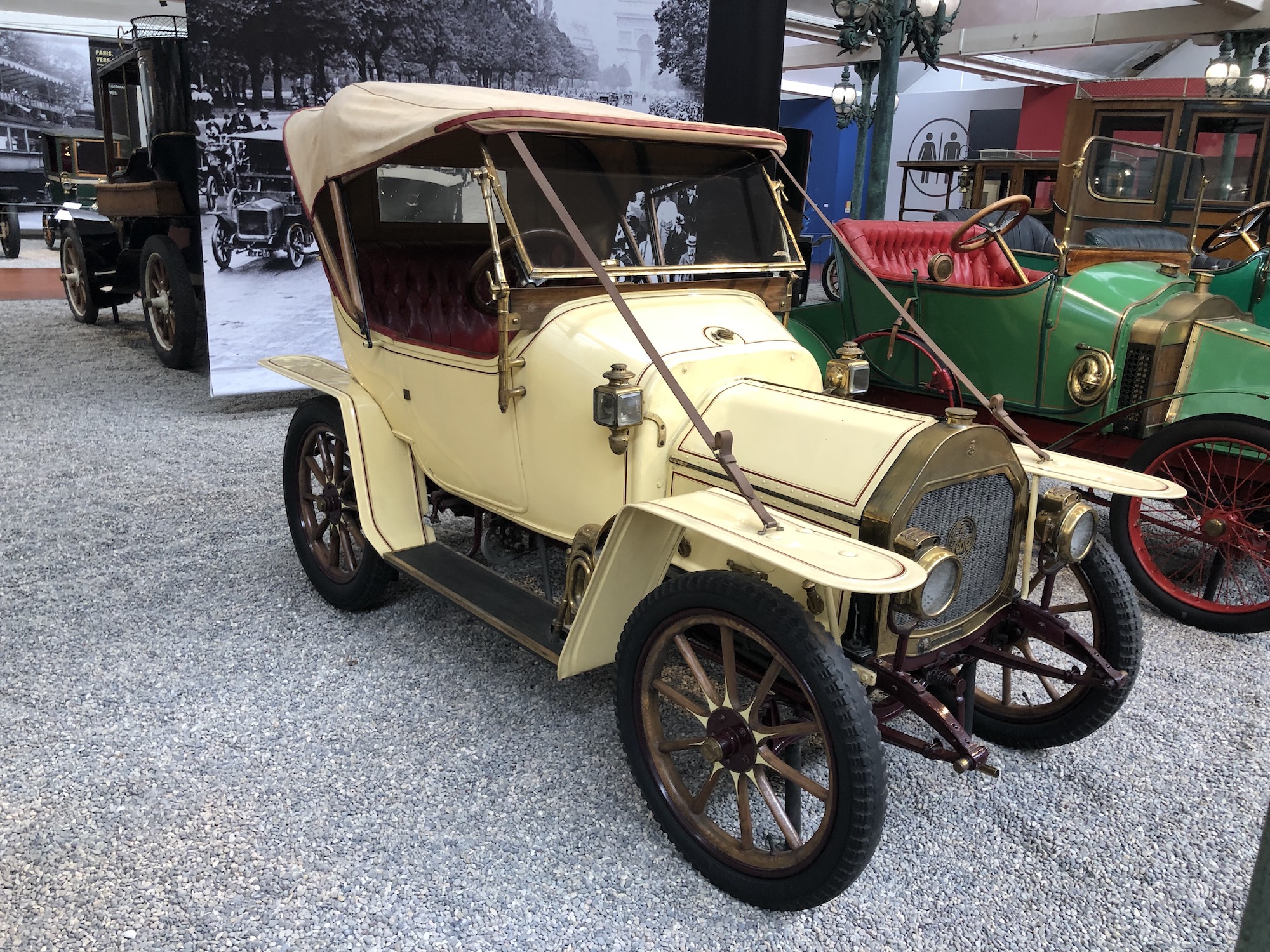 Der erste Abschnitt der Sammlung widmet sich den ältesten Fahrzeugen aus der Automobilgeschichte. Ähneln sie anfangs noch Kutschen, so erkennt man die langsame Entwicklung zu immer größeren und komfortableren Gefährten. Und schon damals begann der Wettlauf, wer das schnellere Gefährt bauen könnte, und mittendrin ist die raketenähnliche „La Jamais Contente“ („Die nie Zufriedene“), die 1899 als erstes Fahrzeug mehr als 100 km/h Spitzengeschwindigkeit erreichte. Das Fahrzeug war übrigens ein Elektroauto.