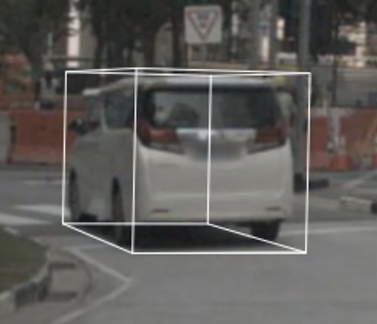 | Annotation eines Fahrzeugs von Video-Daten alleine. | Ansicht von oben mit Überlagerung der LiDAR-Daten |