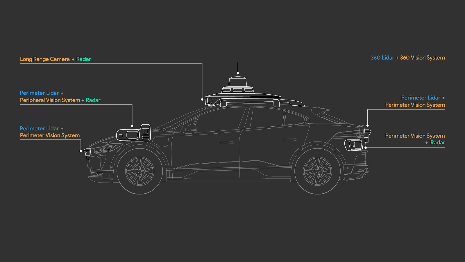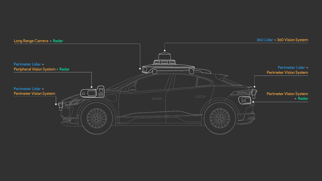 Alle Teile zusammen können dann die Geschwindigkeiten und Richtung anderer Verkehrsteilnehmer präziser bestimmen. Die Dachbox (Waymo Dome) ist durch in die Karosserie und Innenverkleidung des Jaguar iPace integrierten Kabel und Schläuche mit dem Kühlsystem und der Recheneinheit im Kofferraum des iPace verbunden. Diese Teile sind im Kofferraum sogar wasserdicht isoliert, für den Fall dass aus Gepäck im Kofferraum Flüssigkeiten austreten.