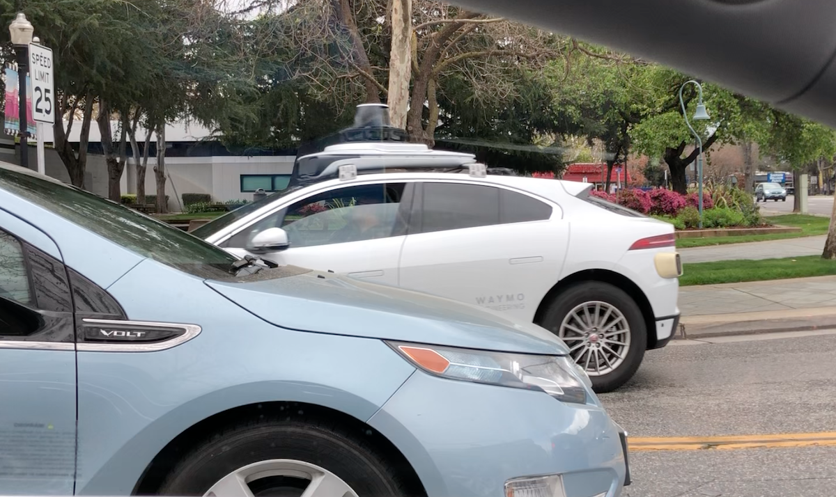Dieses Waymo Engineering-Fahrzeug auf Basis eines elektrischen Jaguar iPace wurde am 7. März 2020 um 9:51 Uhr PST auf der Kreuzung Castro Street El Camino Real in Mountain View gesichtet. Das Fahrzeug ist mit der 5. Generation des Waymo Driver ausgestattet.
