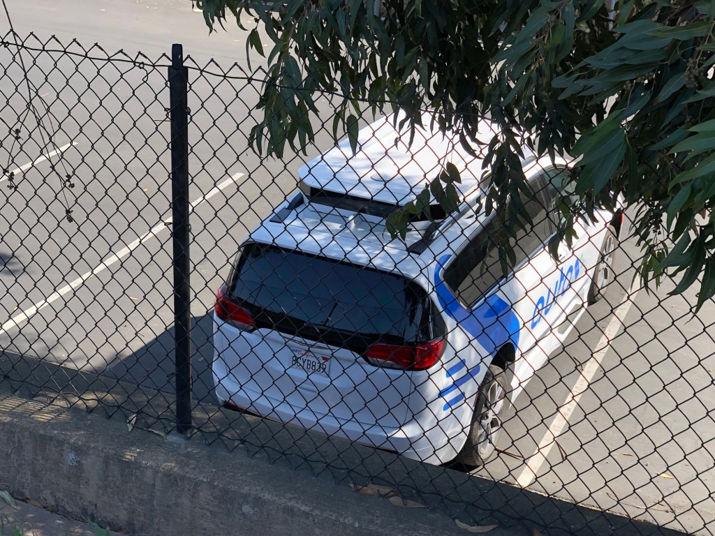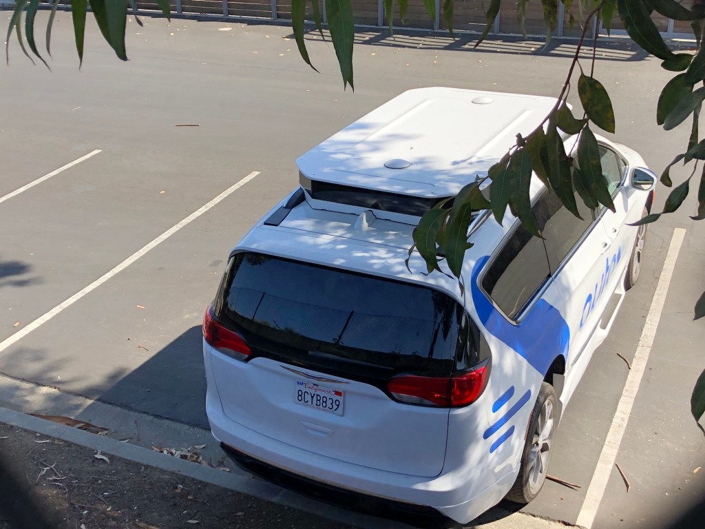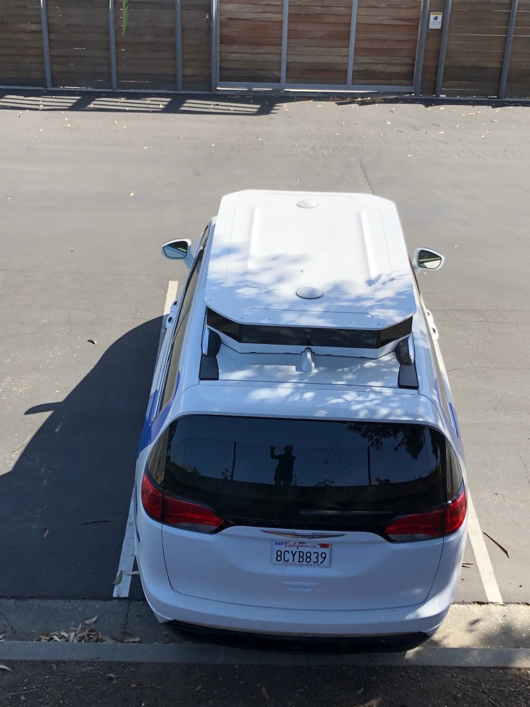 Auf der CES 2020 in Las Vegas sah ich den neuen Sensoraufbau auf einem Fiat Chrysler Pacifica Minivan von AutoX bereits ausgestellt, heute lief es mir in freier Wildbahn über den Weg. Ähnlich wie bei Apple handelt es sich um eine flache Box am Dach, in der alle Sensoren integriert sind. Unterschiede zu dem auf der CES ausgestellten Fahrzeug sind das neue seitliche Trittbrett, sowie die sensorlos scheinenden hintere Stoßstange.