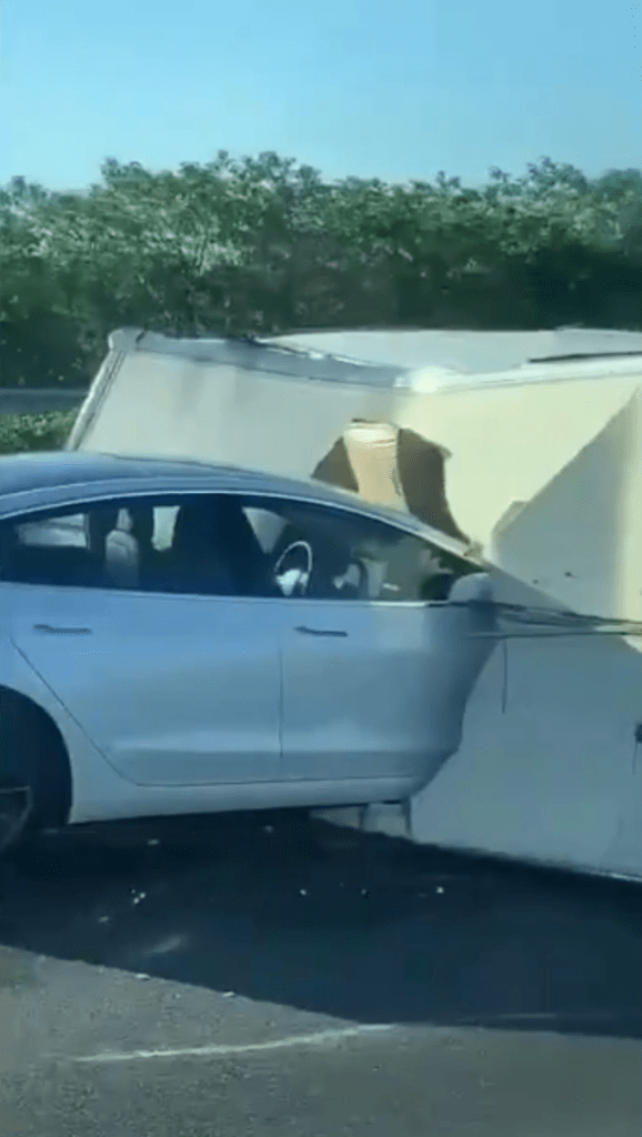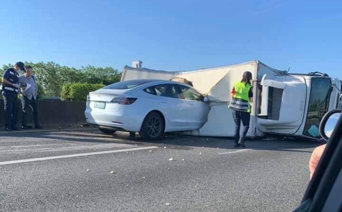 Ein Tesla Model 3 fuhr ungebremst in einen umgestürzten Lastwagen auf dieser Autobahn in Taiwan (Originalquelle: Twitter). Noch ist nicht klar, ob das Fahrzeug im Autopilot-Modus unterwegs war (siehe Update: es war sehr wohl). Man beachte auch die Person, die vor dem umgestürzten LKW auf der linken Überholspur steht und fast überfahren wird.