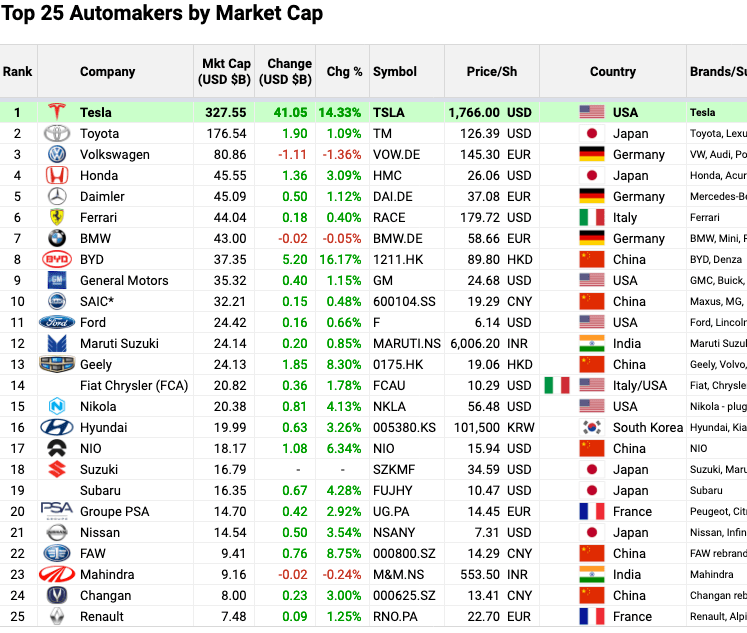 Eine bemerkenswerte Vervierfachung des Aktienkurs, stand doch Anfang des Jahres die Aktie bei 430 Dollar. Seit schon einigen Tagen ist Tesla damit das wertvollste Automobilunternehmen der Welt, und das obwohl der kalifornischer Elektroautohersteller 2019 gerade einmal 367.500 Autos produziert und verkauft hat. Tesla ist damit beispielsweise mehr wert als VW, Honda, Daimler, BMW, GM, Ford, Fiat und Suzuki zusammen genommen. Und auch 50 Prozent mehr wert als der zweitgereihte Toyota.