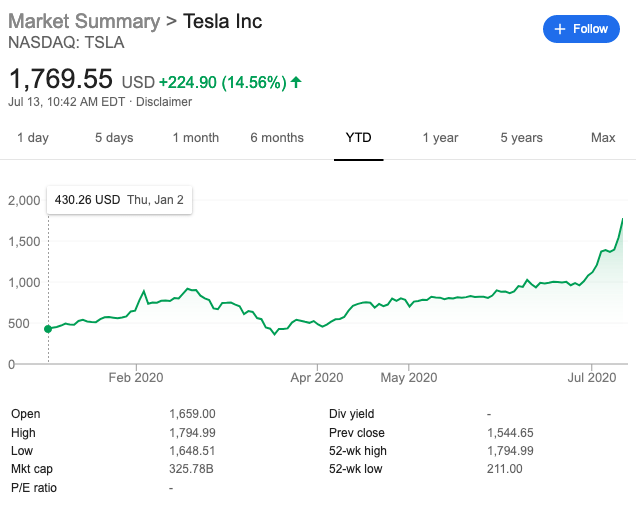 Wenn es eine Aktie zu verfolgen, wenn schon nicht zu verstehen, gibt, dann ist das die Tesla-Aktie. Nach Rekordbewertungen, die in den letzten Monaten die Aktie von einem Hoch zum nächsten steigen sah, lag sie am heutigen Montag nochmals gewaltig zu. Um 12 Prozent stieg der Kurs von knapp über 1.544 Dollar auf aktuell 1.760 Dollar. Und damit schnellte die Marktbewertung von Tesla auf 327 Milliarden Dollar – und der Handelstag hat gerade erst begonnen.