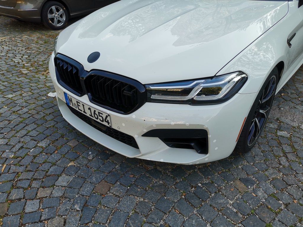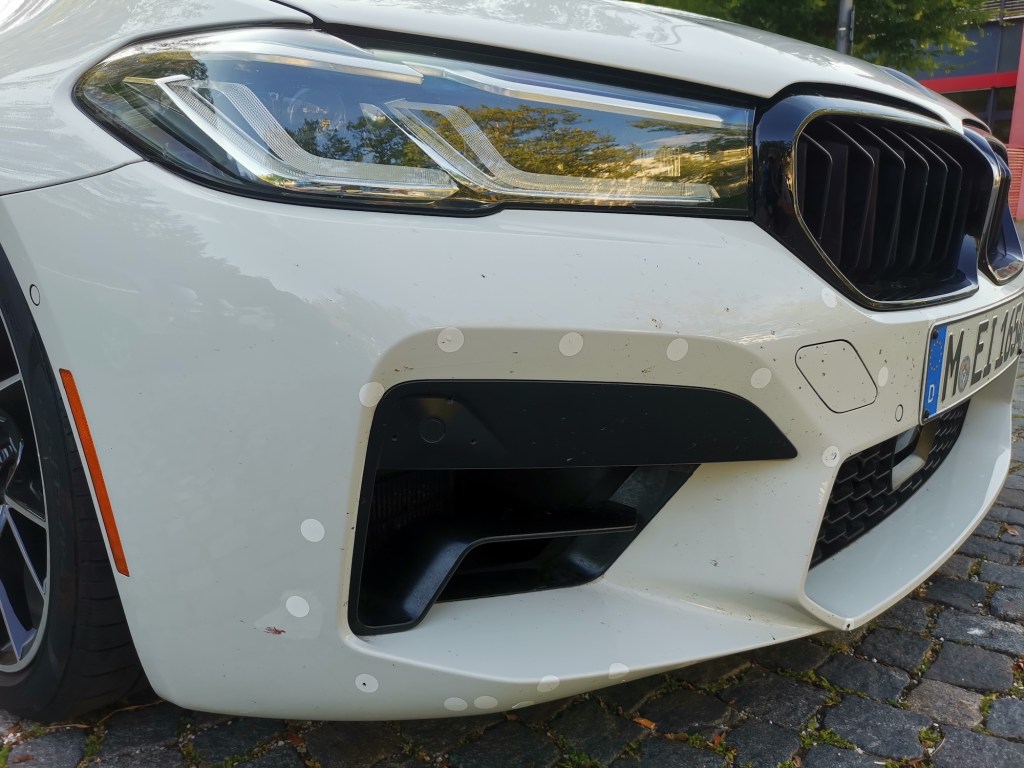 1. Interessant. Kann es sein, das hinter den Dots in teilen Bohrlöcher sind um Sensoren zu befestigen? Einige der Aufkleber sehen zumindest so aus als wäre darunter ein Bohrloch. Da man nicht genau die Farbe des BMW als Aufkleber hatte, wurde wohl weiß gewählt. Nur eine Vermutung.