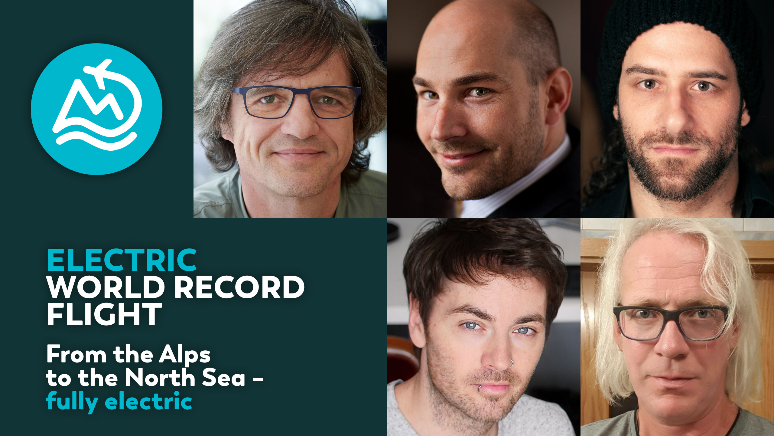 Das Team hinter dem Weltrekordversuch setzt sich aus einer illustren Gruppe zusammen, die vom Zukunftsforscher Morell Westermann geführt wird. Der Schweizer Pilot Marco Buholzer leitet die einzige Elektroflugschule der Welt, während der kreative Ideengeber Tobi Pape als Bierbrauer auf Norderney schafft. Mit Tom Albrecht als Video- und Musikproduzent und Malik Aziz als Mitglied des größten deutschsprachigen Elektromobilitäts-Podcasts CleanElectric sind erfahrene Medien- und Kommunikationsprofis mit an Bord. Alle fünf fahren am Boden bereits jetzt elektrisch und haben den Verein “Freunde der Elektromobilität” gegründet.