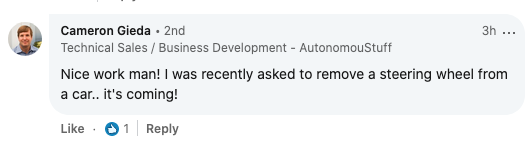 Ein Mitarbeiter von AutonomouStuff, ein Unternehmen, das reguläre Autos mit Hardware für die autonome Fahrzeugentwicklung umrüstet und von vielen Selbstfahrtechnologieentwicklern herangezogen wird, erwähnte auf LinkedIn, dass auch er zum ersten Mal ein Lenkrad aus einem Standardfahrzeug, das er mit Selbstfahrtechnologie ausstatte, entfernen musste.