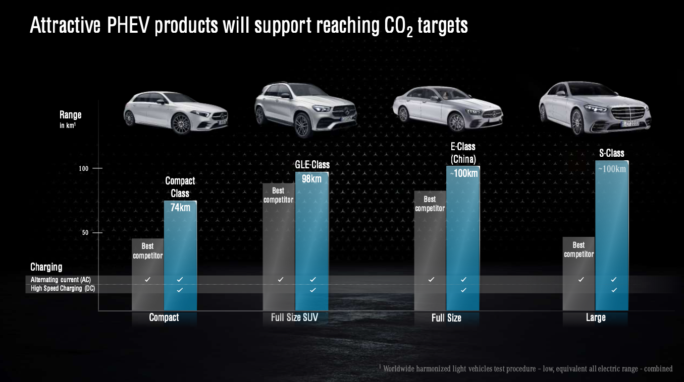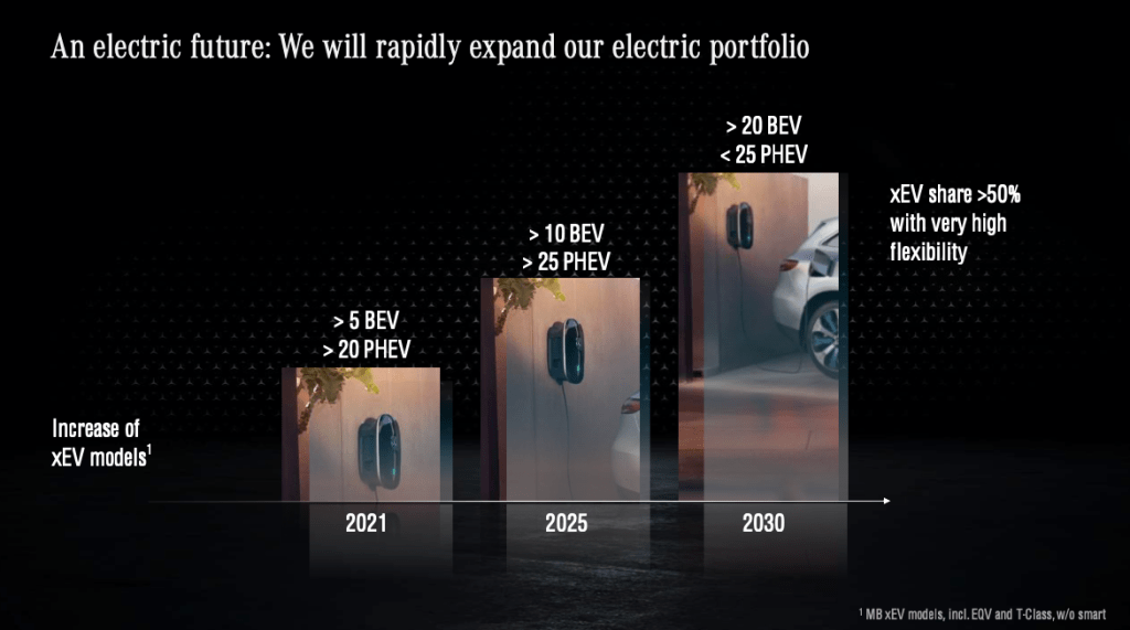 Egal wie man auf die Zahlen schaut, Mercedes setzt vor allem auf Plug-In-Hybride, die auch nur in unambitionierten Zeiträumen und Mengen auf den Markt kommen sollen. Erst 2030 erwartet Daimler , dass mehr als 50 Prozent der eigenen Fahrzeuge irgendwie elektrifiziert sind.