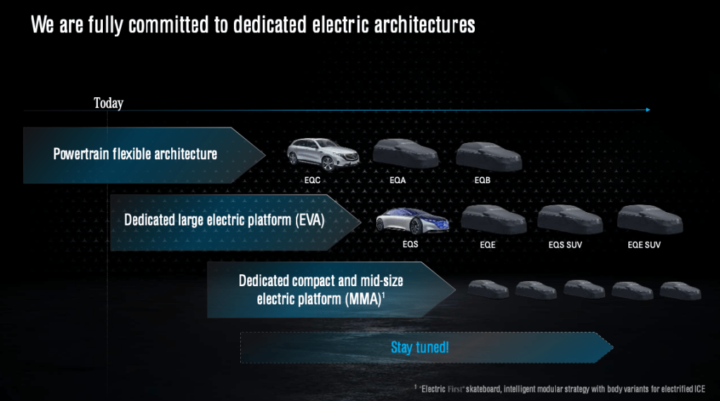 Die erste reine Elektroauto-Plattform für große PKWs soll nächstes Jahr kommen, 9 Jahre nach dem Launch von Teslas Model S, die Plattformen für Mittelklasse und kompakte Fahrzeuge kommen „später“.