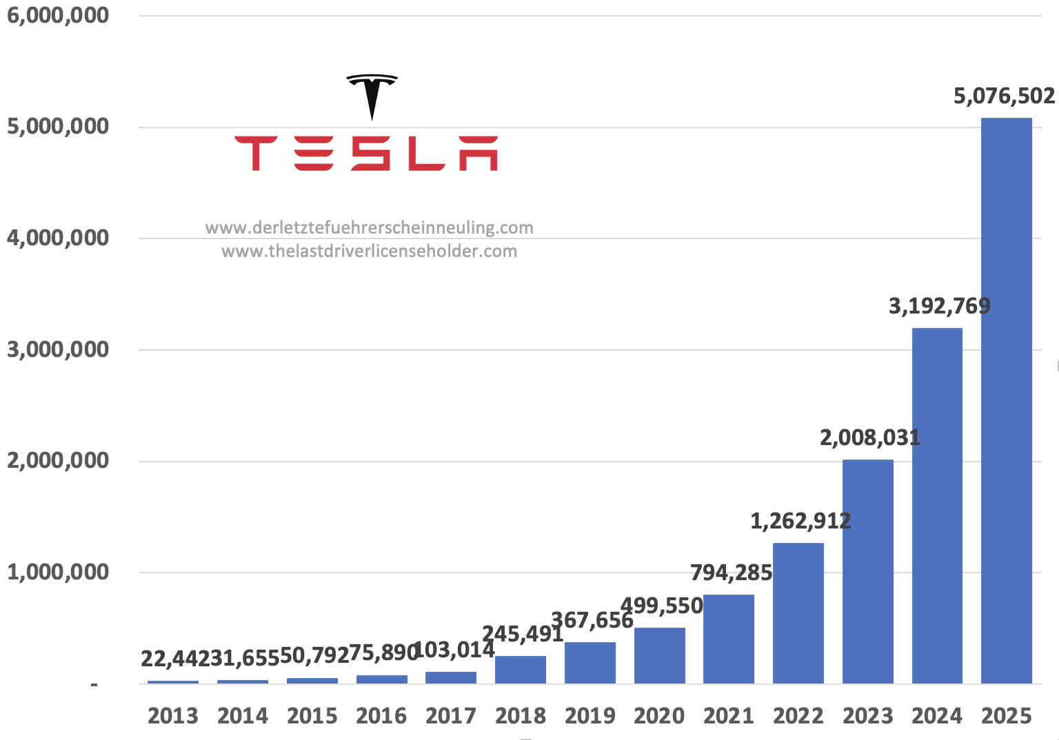 Rechnen wir mit dem Durchschnittswachstumswert über die letzten 7 Jahre von 59 Prozent, dann erreichen die jährlichen Verkaufszahlen im Jahr 2025 sogar 5 Millionen Fahrzeuge pro Jahr.