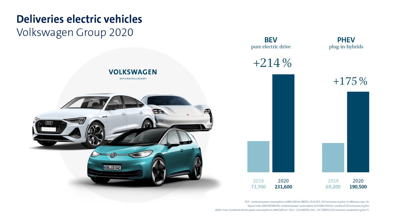 An der Spitze stand der ID.3 mit 56.500 Fahrzeugen, und das nach einem holprigen Start nur wenige Monate vor dem Jahresende aufgrund von Softwareproblemen, die die Auslieferung um fast ein Jahr verzögert hatte. Der Audi e-tron kam auf 47.300, Stück und der Porsche Taycan auf 20.000 Stück.