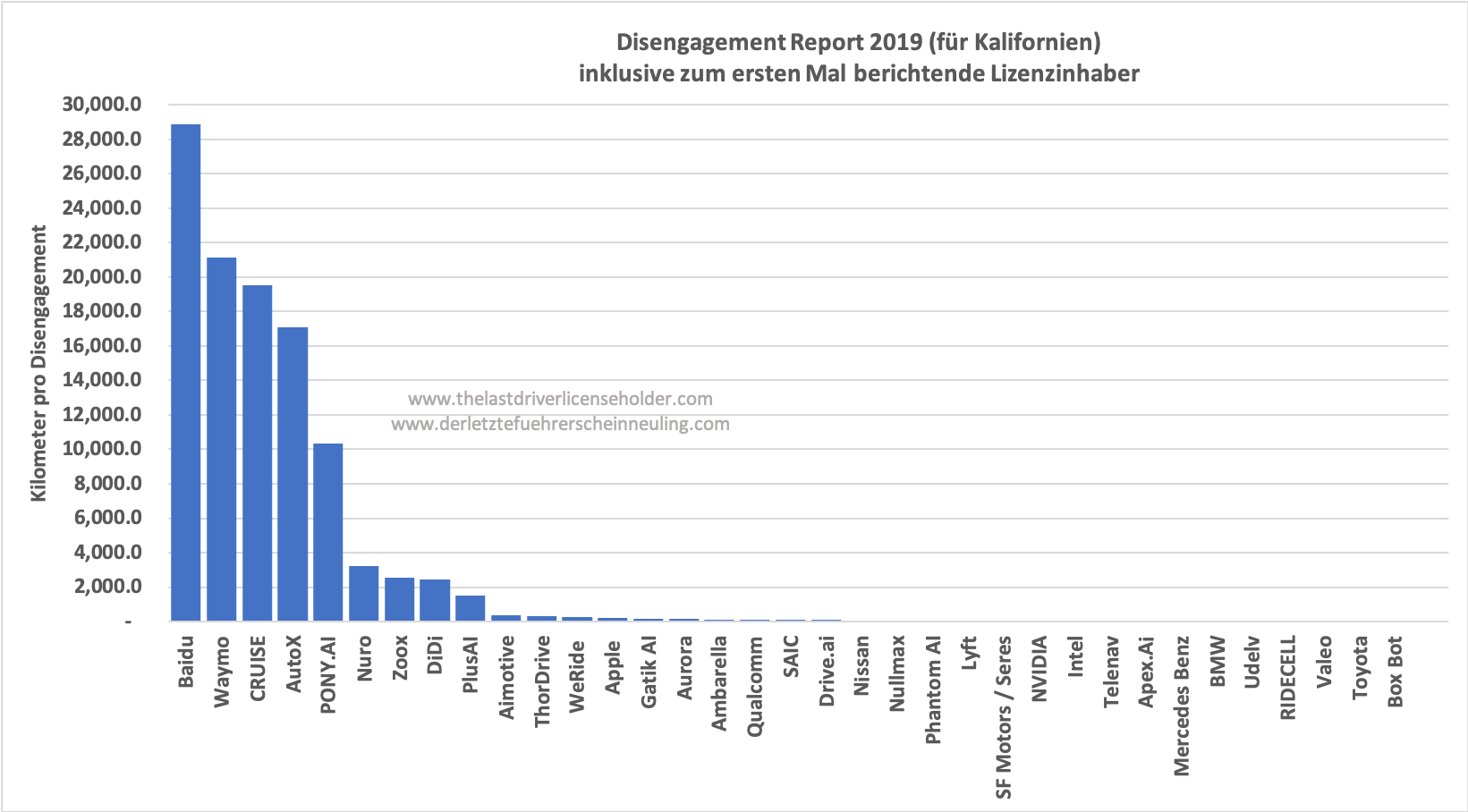 Das 2020-Chart sieht da um etliches vernünftiger aus. Bevor wir uns hier an Tesla aufreiben: ich erwähne in diesem Kommentarabschnitt Tesla mit keinem Wort. Wenn ich von 5-7 Jahren Rückstand spreche, dann schaue ich auf jemand wie Waymo, GM Cruise oder Zoox, und stelle die jemanden wie Daimler, VW oder BMW gegenüber. Auf welche Zahlen beziehe ich mich dabei? Auf die einzig öffentlich verfügbaren, nämlich denjenigen aus den Disengagement-Bericht 2019 (Baidu ist hier übrigens eine eigene Geschichte wert gewesen).