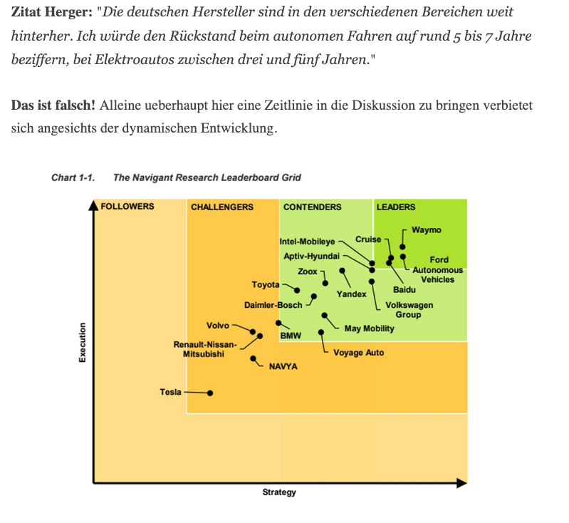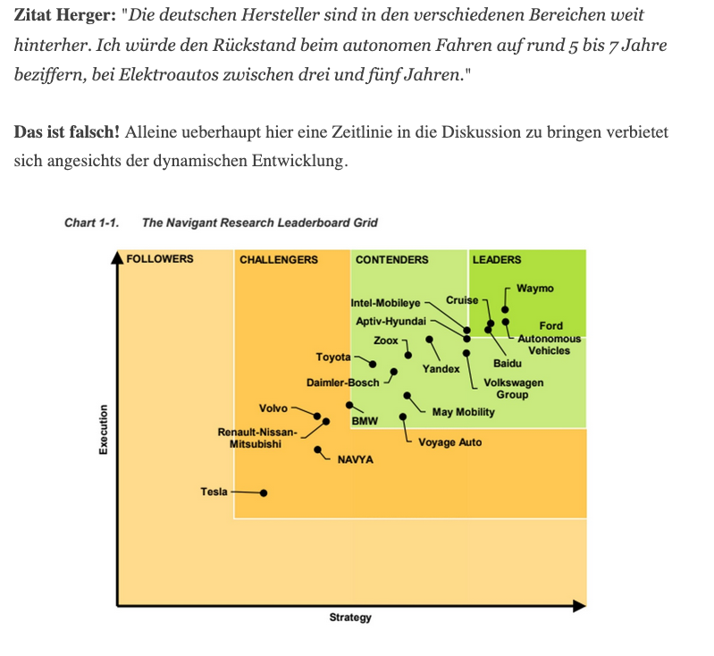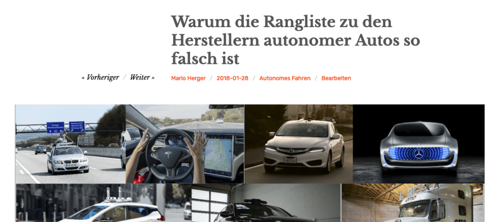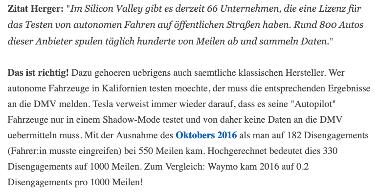 Und noch eine Anmerkung: ich erwähne im Interview an dieser Stelle nichts zu Tesla. Das ist die große Unbekannte und wenn ich autonome Autos hier vergleiche, dann beziehe ich mich vor allem auf diese Experimentalfahrzeuge.