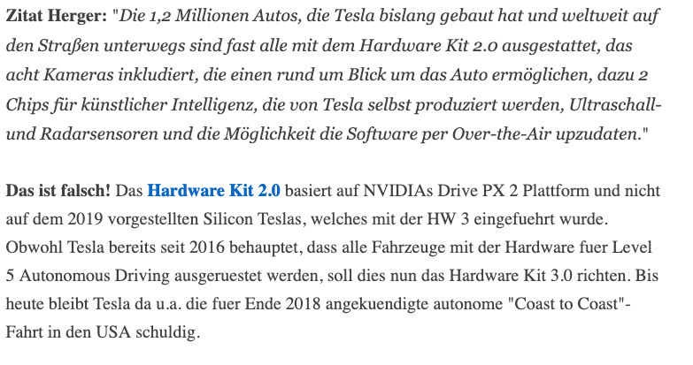 Die richtige Schreibweise in diesem Artikel sollte ‚Hardware Kit 2.x‘ sein. Das inkludiert das Hardware Kit 2.0, 2.5 und 3.0. Seit April 2017 werden von Kundenfahrzeugen mit dem Hardware Kit 2.0 Daten an Tesla geliefert. Mit dem Hardware Kit 3.0 (seit April 2019 in den Autos verbaut) werden auch die Tesla-eigenen KI-Chip verbaut. Jede Besitzer, der ein Fahrzeug mit dem Hardware Kit 2.0 und höher hat, kann bei Tesla einen Gratisaustausch auf das 3.0 Chip-Set beantragen. Ich selbst habe mein Model 3 seit Juni 2019 und hatte bereits das Hardware Kit 3.0 drinnen, meine Frau, die ihr Model 3 im Jänner 2019 erhielt, hat es sich bereits austauschen lassen. Damit sind bislang sein April 2019 eine dreiviertel Million Teslas mit dem Hardware Kit 3.0 ausgestattet, und nochmals ca. eine dreiviertel Million mit den Hardware Kits 2.x. Potenziell haben somit knapp 1,5 Millionen Teslas (berücksichtigend einen erfolgten Chip-Austausch und eine erworbene FSD-Lizenz) die Hardware-Voraussetzungen, die Full Self Driving Software zu verwenden, sobald sie für alle Kunden verfügbar ist.