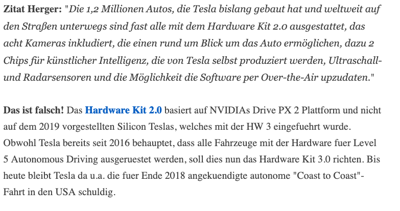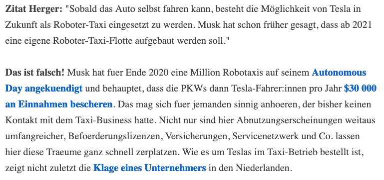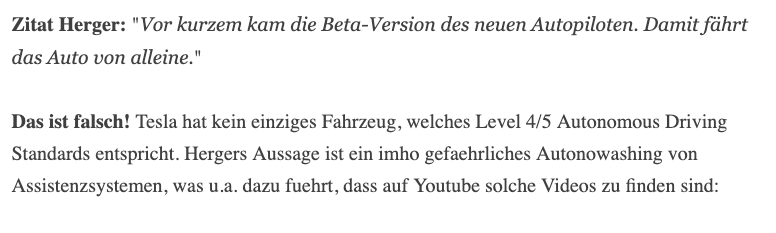 Aber wollen wir sachlich bleiben, wir sind ja hier zum Lernen und ich freue mich für jede Gelegenheit, dass wir alle mehr zu autonomen und elektrischen Autos lernen. Ich füge immer einen Schreenshot der jeweiligen vom Faktenchecker-Experten fact-gecheckten Aussagen an, und gehe dann auf die einzelnen Argumente ein.