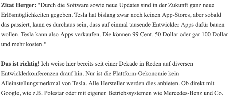 Vielleicht noch etwas dazu: wir sehen bereits jetzt in den alle 2-3 Wochen erfolgenden Software-Updates per OTA, wie die Technologie schon für so einen App-Store bereit ist. Wir kriegen immer wieder neue Apps aufs Fahrzeug, u.a. Videospiele, Videostreaming-Apps, Musik-Apps etc. Und mit dem Interior-Refresh beim Model S und Model X gibt’s auch für Passagiere im Fonds einen neuen Bildschirm, der mit Content befüllt werden will.
