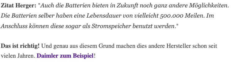 Nicht immer nur auf (ehemalige) Angehörige eines deutschen Automobilkonzerns hören, wie der Stand der Technik gerade bei den neuen Technologien, wo die selben Automobilkonzern hinterhinken, ist, sondern sich einlesen und selbst erleben. Einmal zu mir ins Silicon Valley kommen und an einem Tag mal so ein Gefühl kriegen, was hier wirklich abgeht, und dann das in Kontext zu deutschen Herstellern setzen. Es war noch für jeden meiner anfänglich selbstsicheren deutschen Automobilmanager eine Ernüchterung. Anstatt sich in unnötige Zerwürfnisse mit mir zu verlieren, lieber den Arsch aufreißen, dass wir in Europa unsere Industrie nicht verlieren.