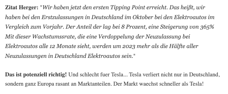 An den Auslieferungszahlen sehe ich nichts Schlechtes. Auch nicht für Tesla. Weltweit eine halbe Million Autos verkauft und Projektionen von 700.000 bis 800.000 im Jahr 2021. Je größer die Auswahl an Elektrofahrzeugen, desto besser für Elektroautos. Die Kannibalisierung passiert mit den Verbrennern, und darunter leidet Tesla bestimmt nicht.