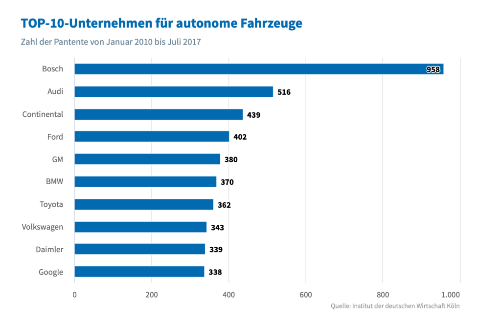 Ähnliche Meinungen hört man, wenn man technische Experten fragt, die auf die Anzahl der Patente zum autonomen Fahren hinweise, bei denen deutsche Hersteller und Zulieferbetriebe federführend seien.