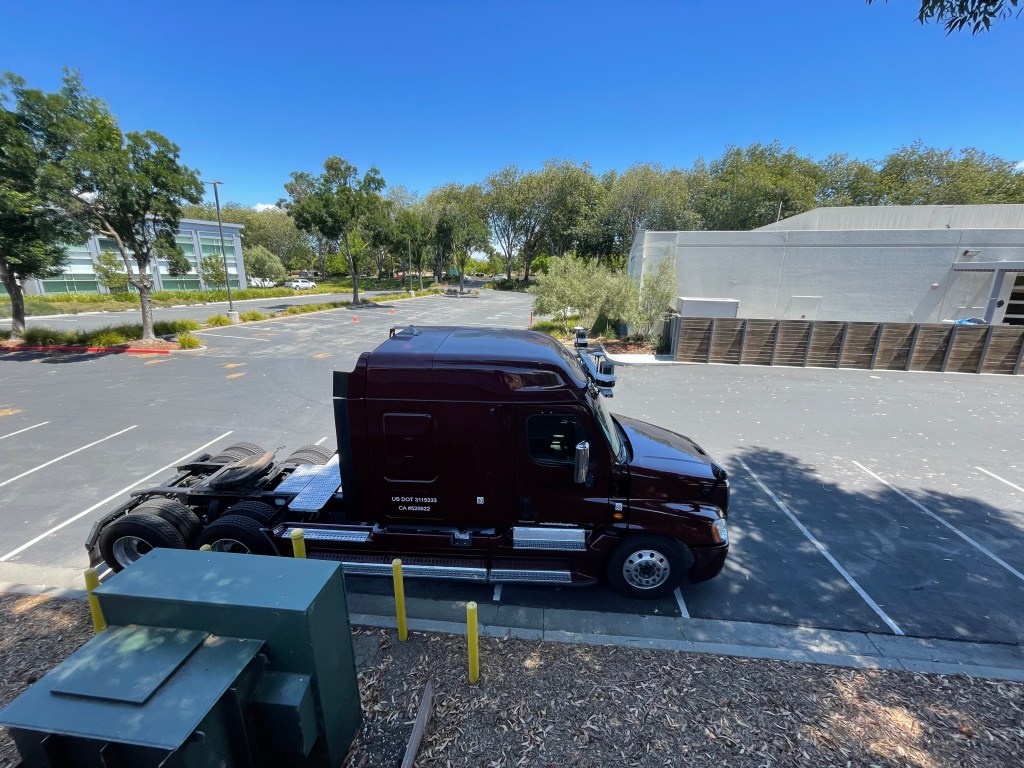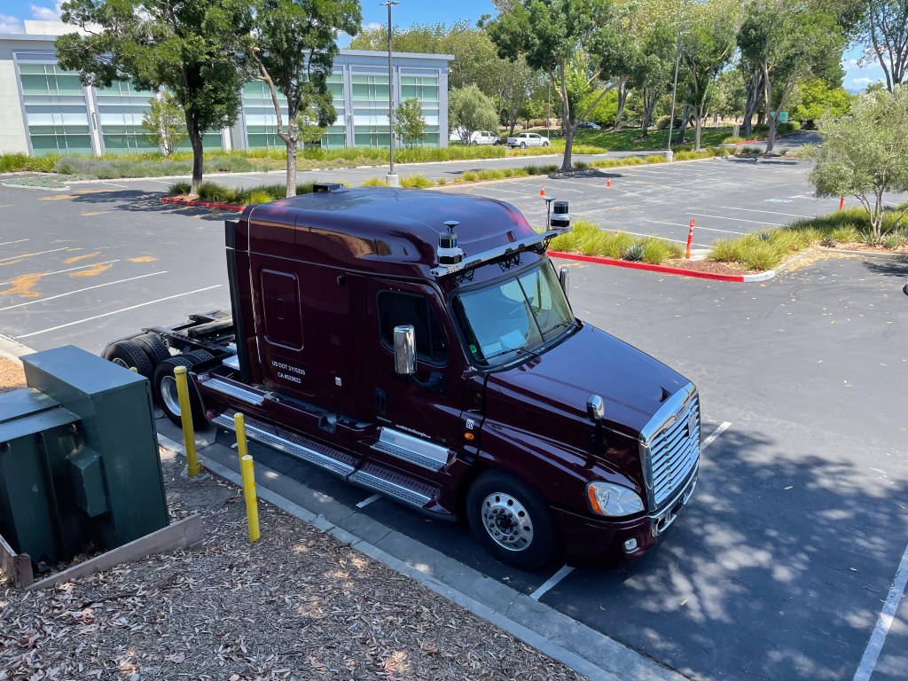 Das chinesische Start-Up AutoX hat auf seinem Firmengelände auch einen LKW mit einer Sensorsuite ausgestattet, um seine Selbstfahrtechnologieplattform auch auf dieser Fahrzeugplattform zu testen. Hier ist die Zugmaschine mit LiDARs, Kameras und GPS zu sehen.