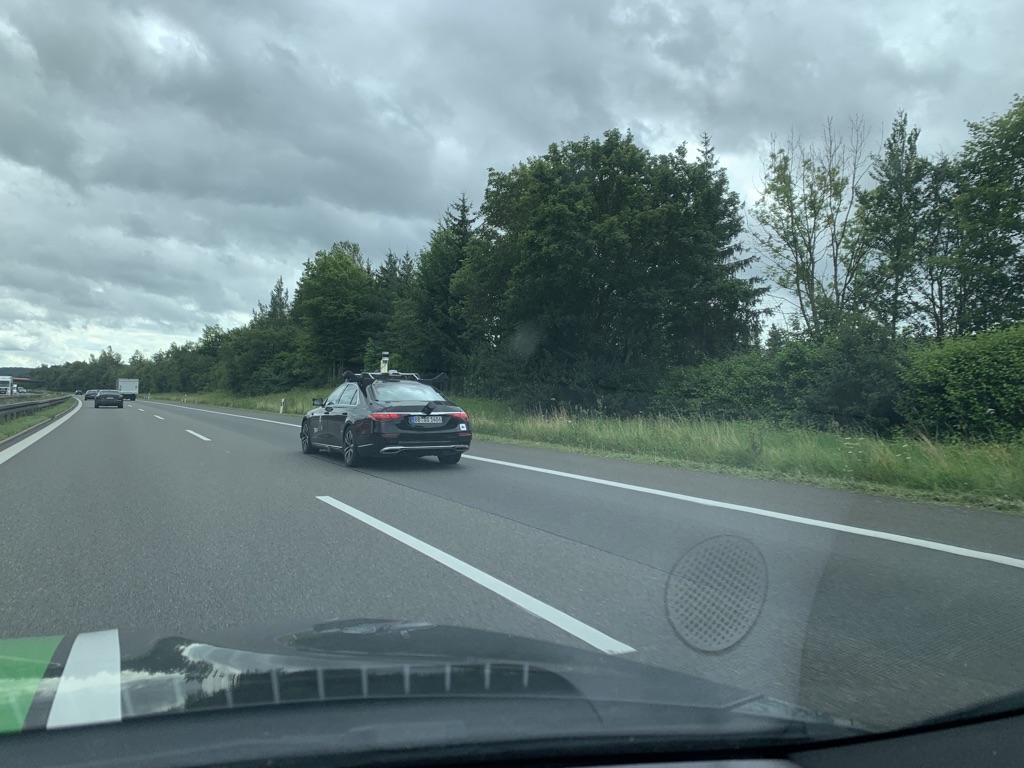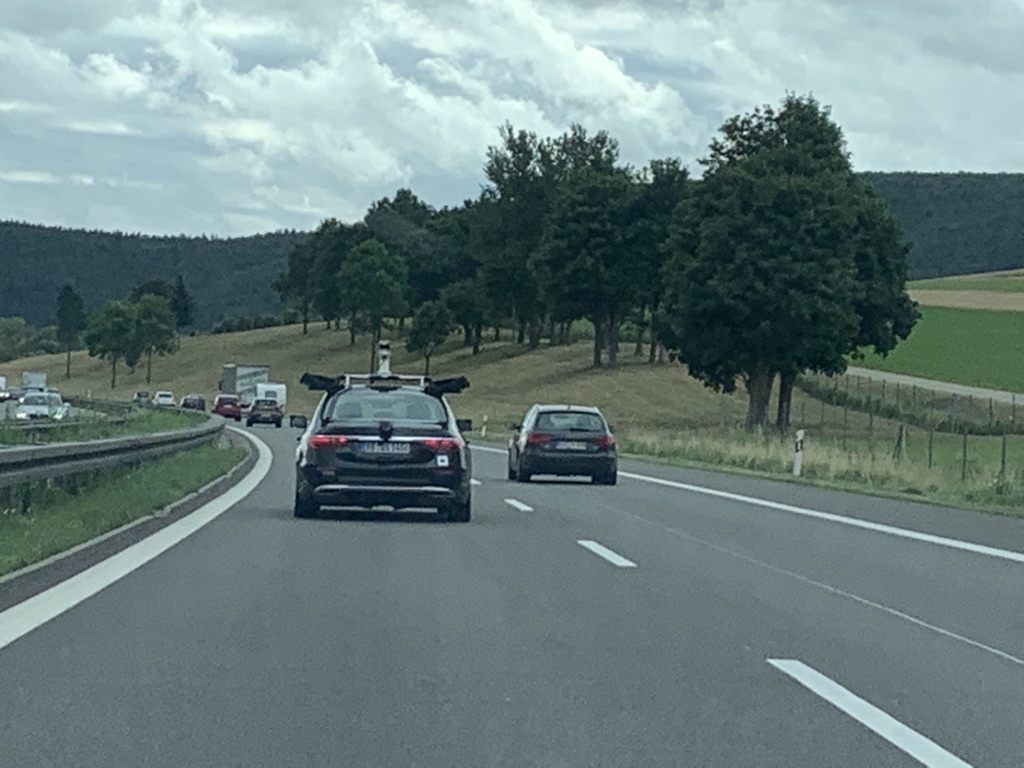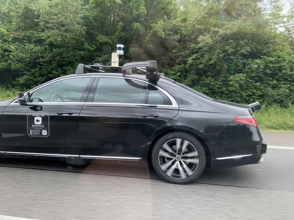 Von unserem Leser Gerd Moll erhielten wir diese Serie an Fotos eines Mercedes Kameratestvehikels. Die Aufschrift auf der Fahrertür ordnet das Fahrzeug der Mercedes Benz AG zu, das für Videotests verwendet wird. Es ist mit mindestens sechs (auf den Fotos erkennbaren) LiDARs ausgestattet, von denen vier auf den Boden gerichtet sind.