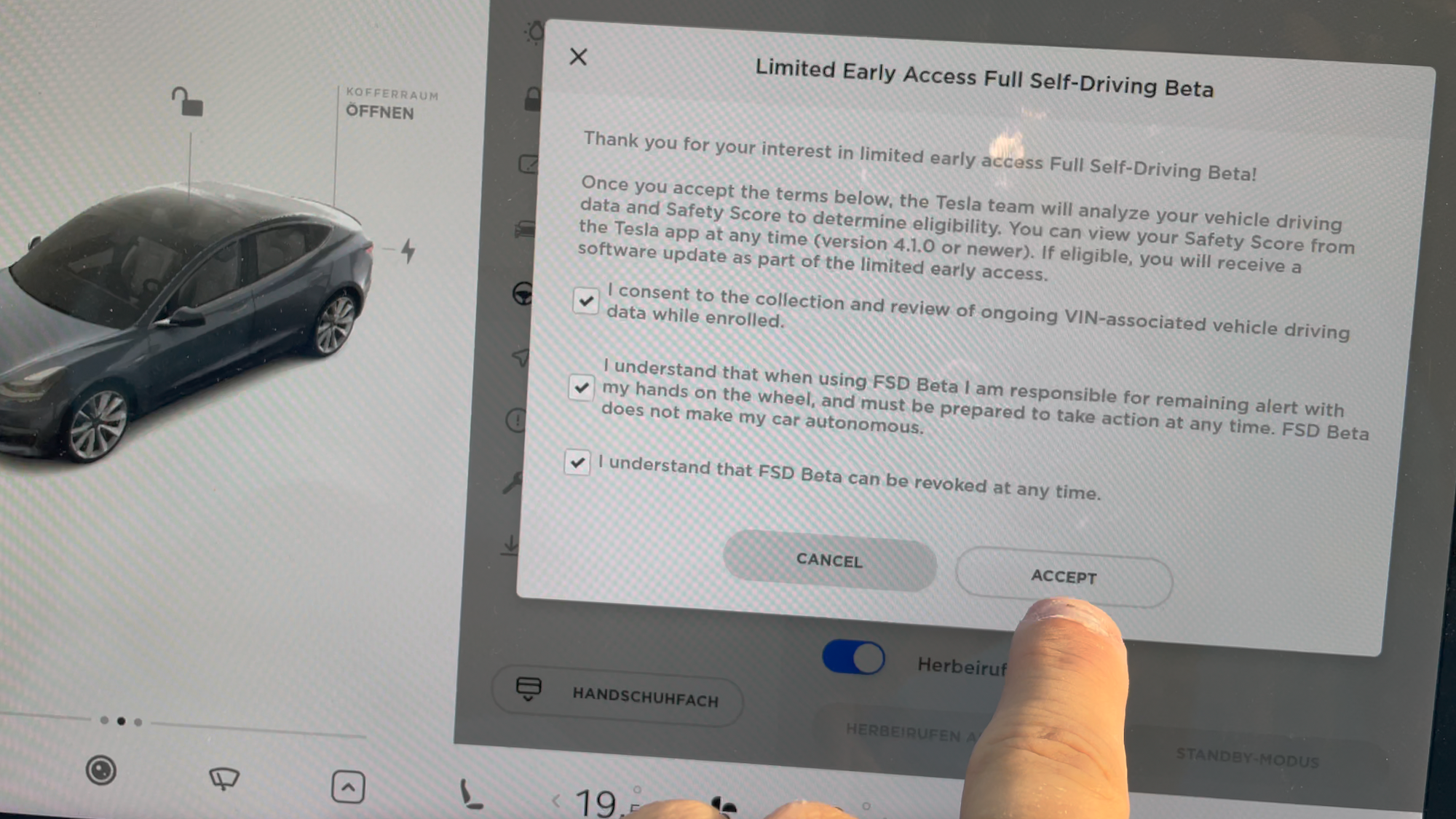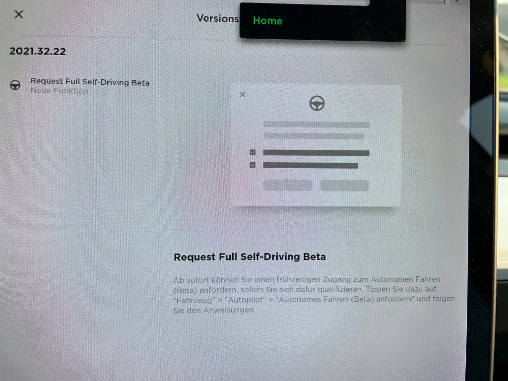 Heute war es tatsächlich soweit. Wie Elon Musk gestern versprochen hatte, gab es heute einen Software-Update (Version 2021.32.22), der einzig und alleine eine Schaltfläche zum Anfragen um Aufnahme in das Full Self Driving (FSD) Betatesterprogramm brachte. Und den habe ich gedrückt und die Benutzungsbedingungen akzeptiert. Jetzt muss ich ein paar Tage warten, ob ich gemäß Tesla ein ausreichend gutes Fahrsicherheitsrating habe, um mich für das Programm zu qualifizieren.