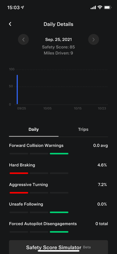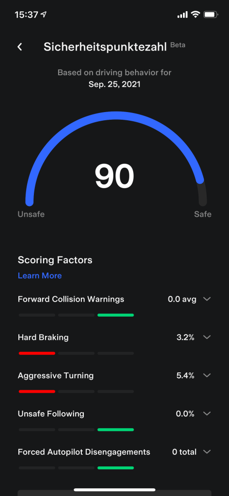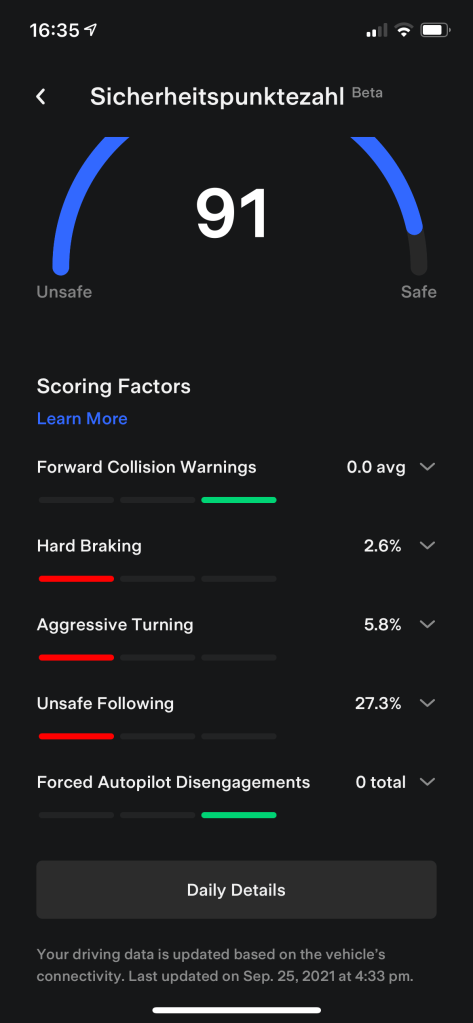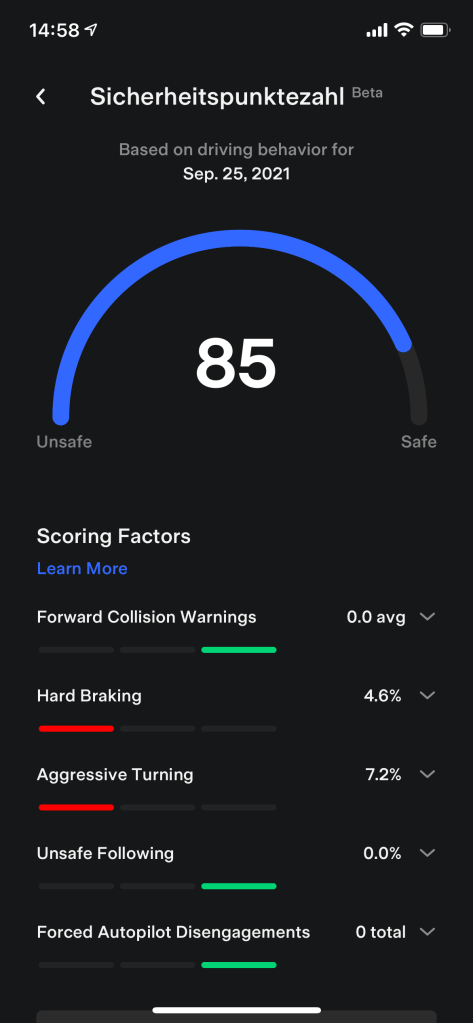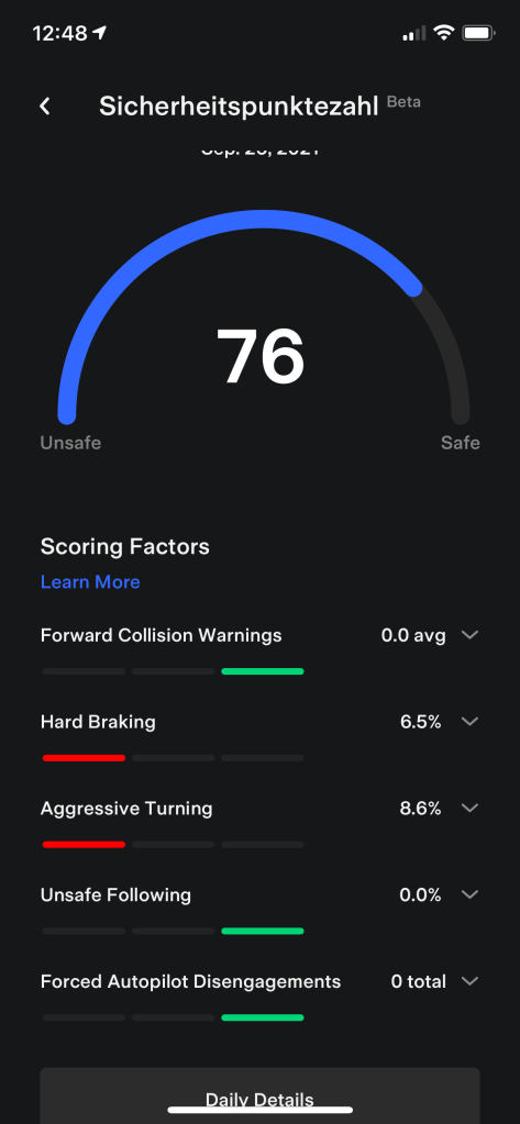 Warum mache ich das? Wegen der Full Self Driving Beta, die nun auch weiteren Teslakunden angeboten werden soll. Nachdem ich sie angefragt hatte, überprüft Tesla nun die nächsten Tage mein Fahrverhalten und wird sich dann entscheiden, ob ich mir die FSD Beta auf mein Fahrzeug laden und ausprobieren kann.