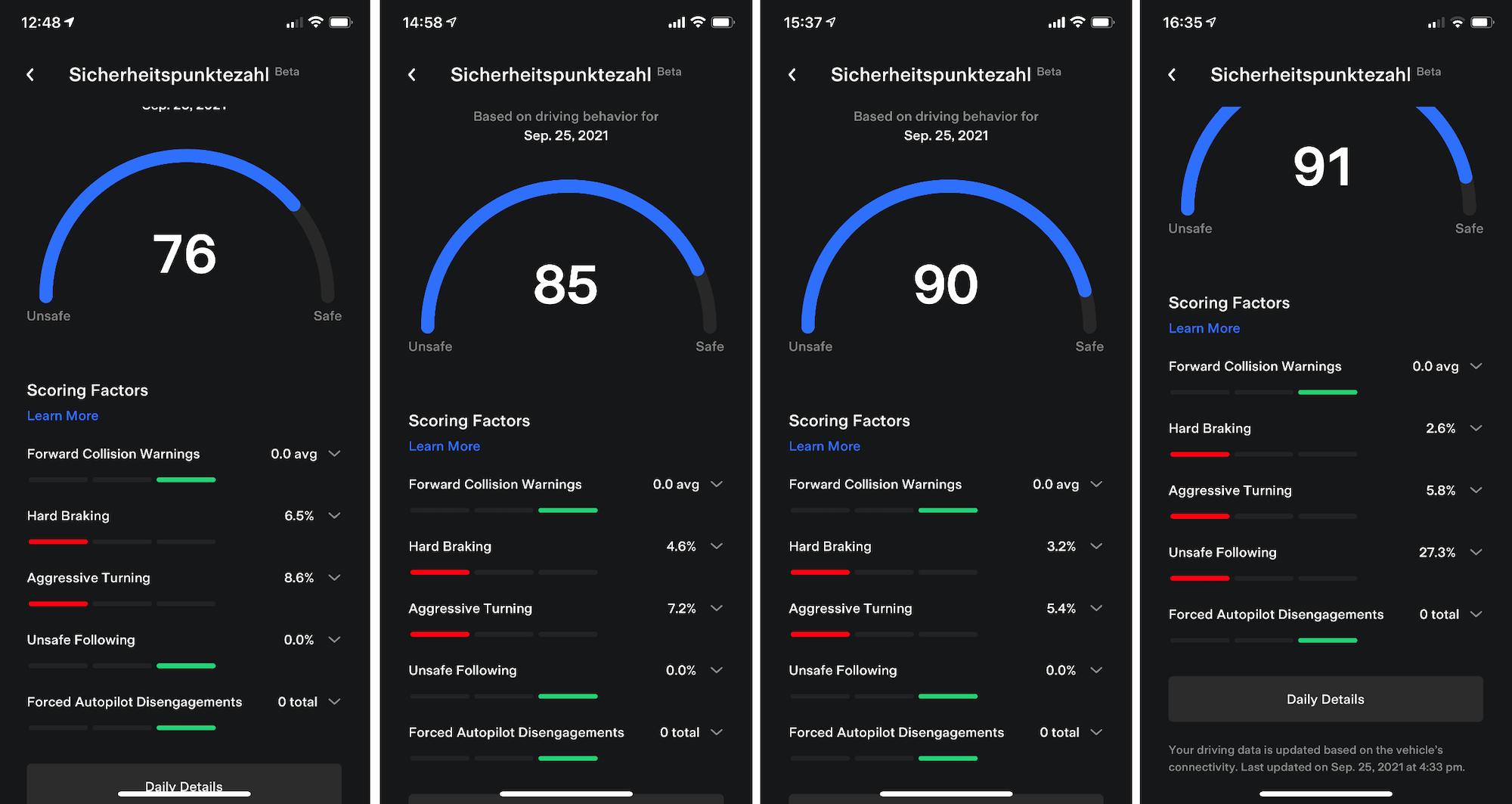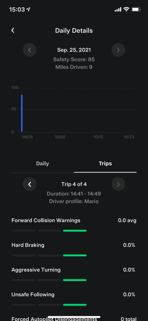 Wählt man dieses Menü aus, dann erscheint ein weitere Bildschirm mit dem Score, den fünf Faktoren und deren Werten, sowie Trips und die Aufschlüsselung nach den Tagesfahrten die man hatte. Ich selbst begann mit einem Wert von 76. Nach mehreren weiteren Fahrten, bei denen ich vorsichtig unterwegs war, konnte ich mich auf eine Sicherheitspunktezahl von 91 steigern. Die Aktualisierung des Scores geschah dabei unmittelbar nach jeder Fahrt, ich konnte somit an nur einem Tag mich von 76 auf 91 Punkte steigern. Mit der Aufschlüsselung der sicherheitsrelevanten Faktoren erhalte ich auch zeitnah eine Rückmeldung zu meinem Fahrstil und Fahrverhalten.