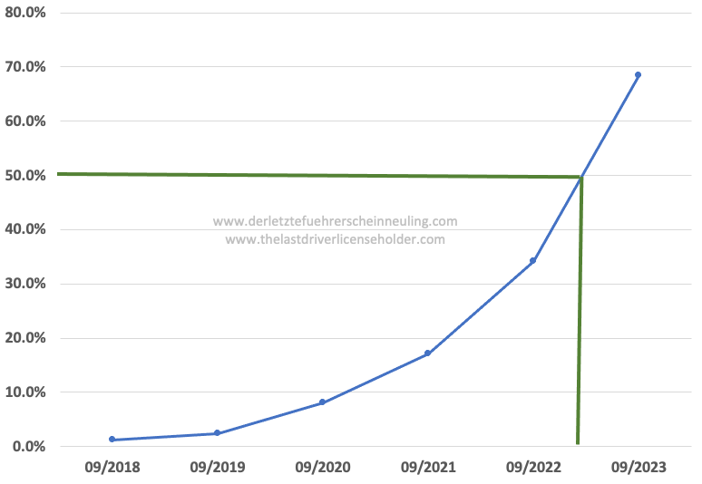 Extrapolieren wir den Trend bei den Neuzulassungen, dann werden in Deutschland bei solchen Verdopplungsraten von weniger als 12 Monaten bereits 2023 die Mehrheit aller neu zugelassenen Fahrzeuge Stromer sein. Sowohl Diesel als auch Benziner, und Plugin-Hybride werden abnehmen und vom Markt verschwinden. Um 2025 sprechen wir dann von Anteilen von über 80% an den Neuzulassungen.