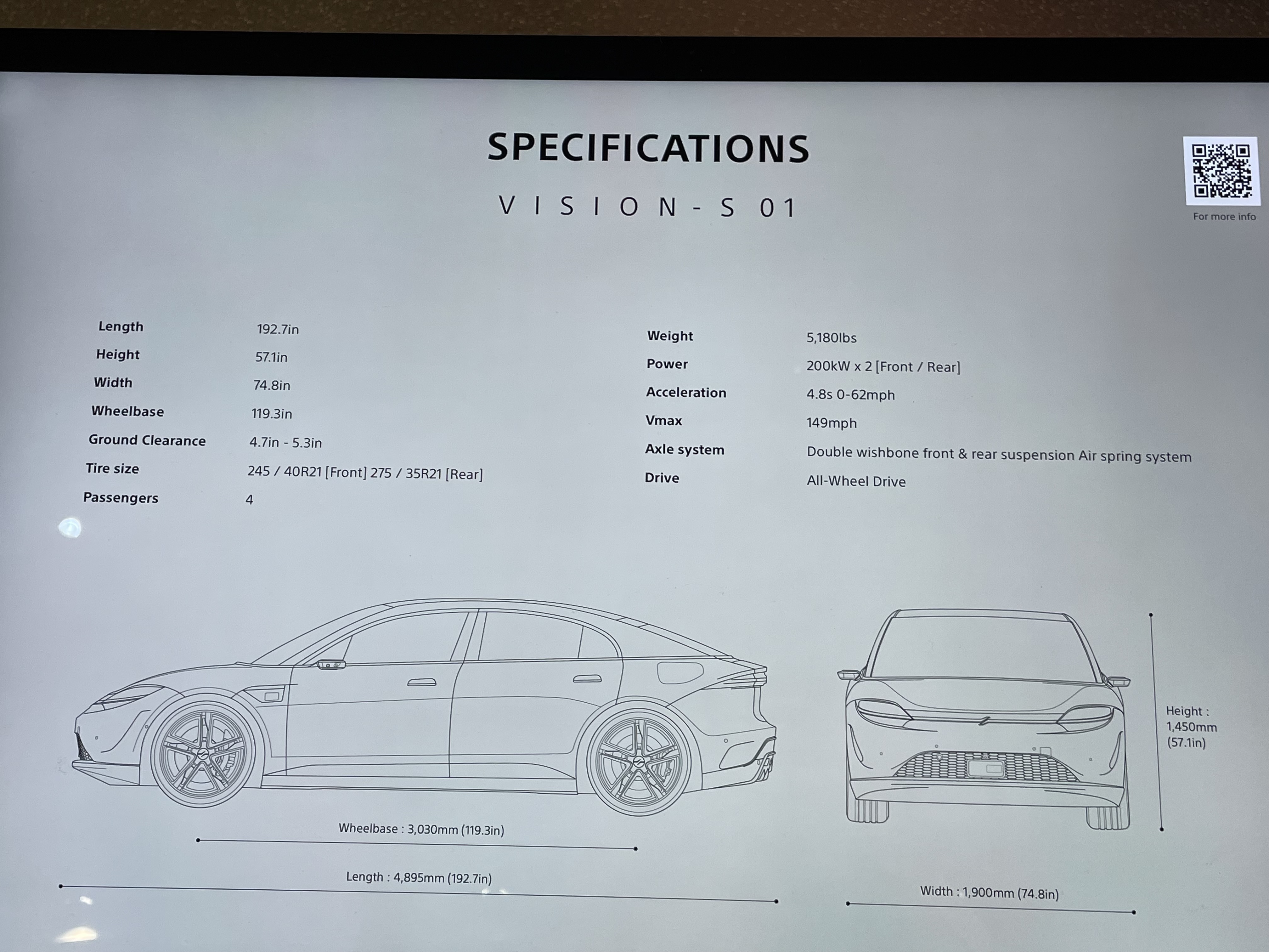 Wie schon zur CES 2020 war auch diesmal wieder der der Sony Vision S01 auch da. Hier dazu ein paar Bilder, inklusive Spezifikationen. Radstand 3,03 Meter, Länge 4,895 Meter, Breite 1,9 Meter, Höhe 1,45 Meter, Gewicht 2.350 Kilogramm, Höchstgeschwindigkeit 238 km/h, Beschleunigung von 0 auf 100 km/h in 4,8 Sekunden, 200 kW Antrieb, Vierradantrieb und Platz für 4 Passagiere.