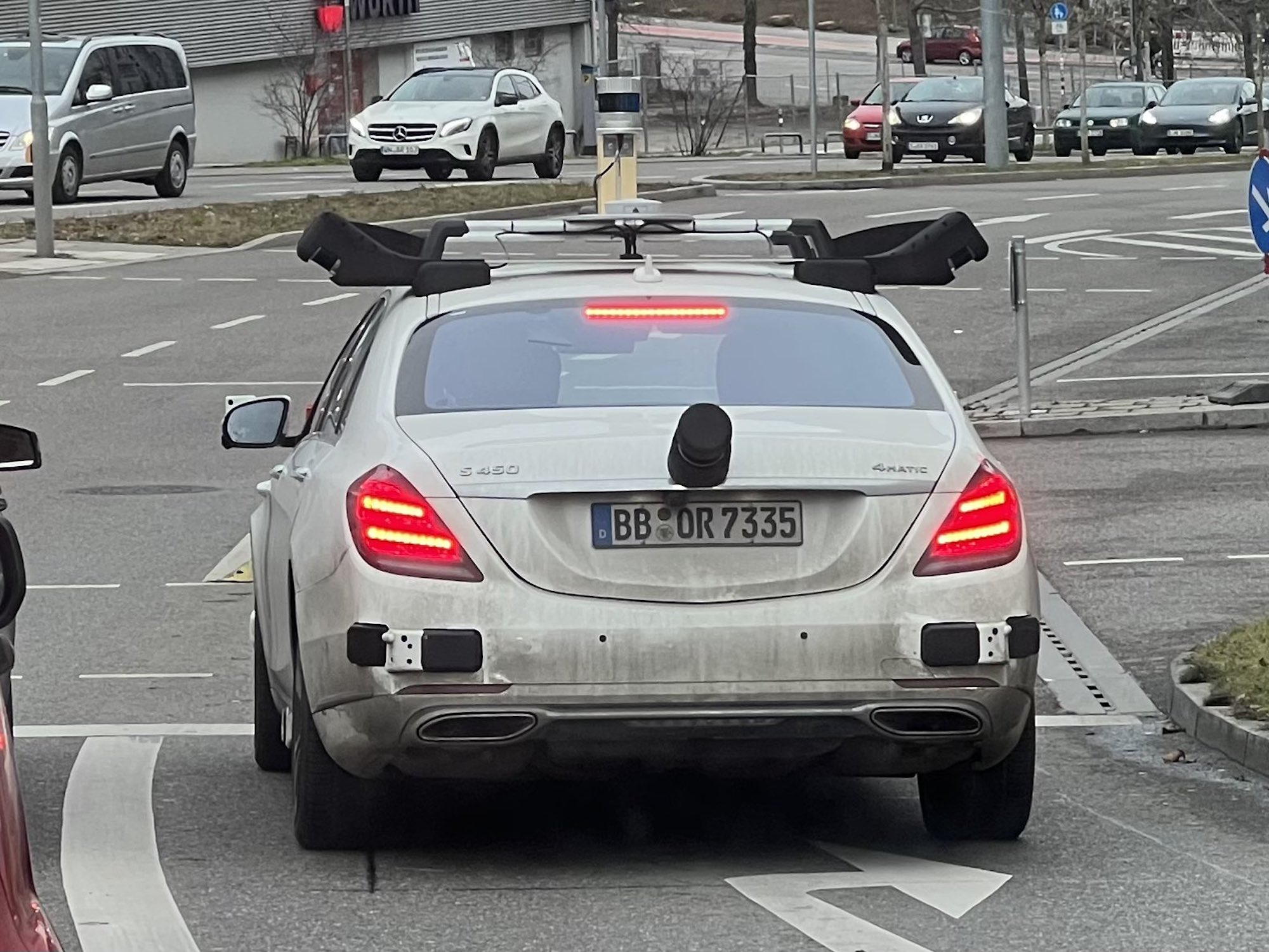 Ein Testfahrzeug von Mercedes Benz wurde heute in Stuttgart gesichtet. Deutlich erkennbar sind vier Lidars, Radar und Kamera am Rückspiegel in einem recht rudimentären Aufbau. Die seitlich nach unten gerichtete Anordnung der Lidars weist auf ein Mappingfahrzeug hin, das hochpräzise Navigationskarten erstellt.