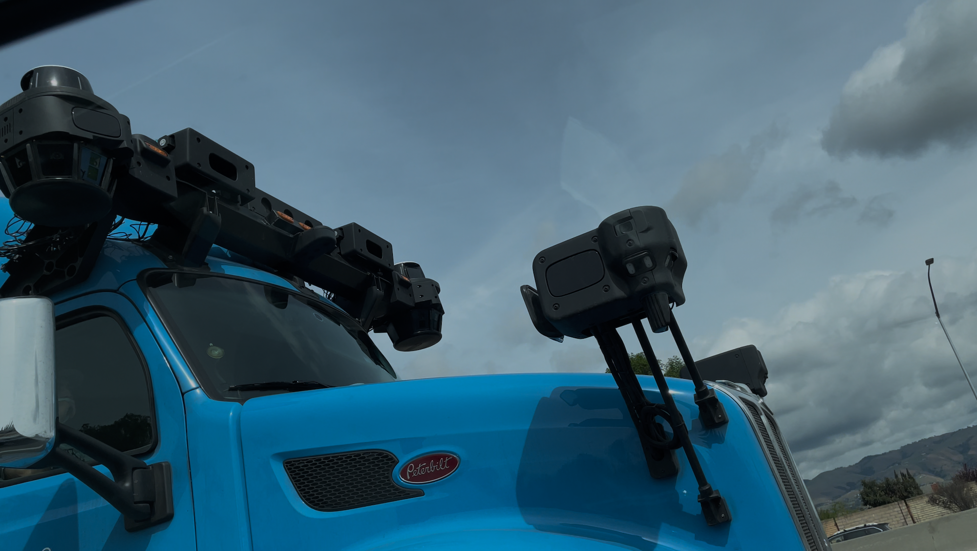 Dieser autonome Waymo Via-Lkw wurde am 15. März 2022 auf dem Highway 101 in San José in Richtung Süden gesichtet. Wir können deutlich die massiven Sensorgestelle auf dem Dach der Fahrerkabine und an den Seiten sehen.
