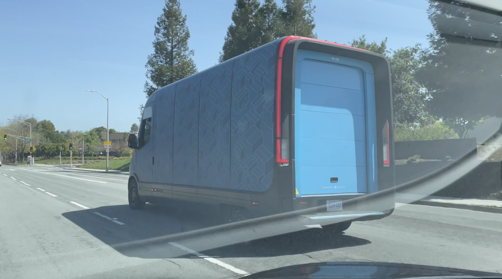 Dieser Prototyp eines elektrischen Lieferwagens von Rivian wurde am 6. April 2022 gegen 12:15 Uhr PDT auf der Page Mill Road in Palo Alto gesichtet.
