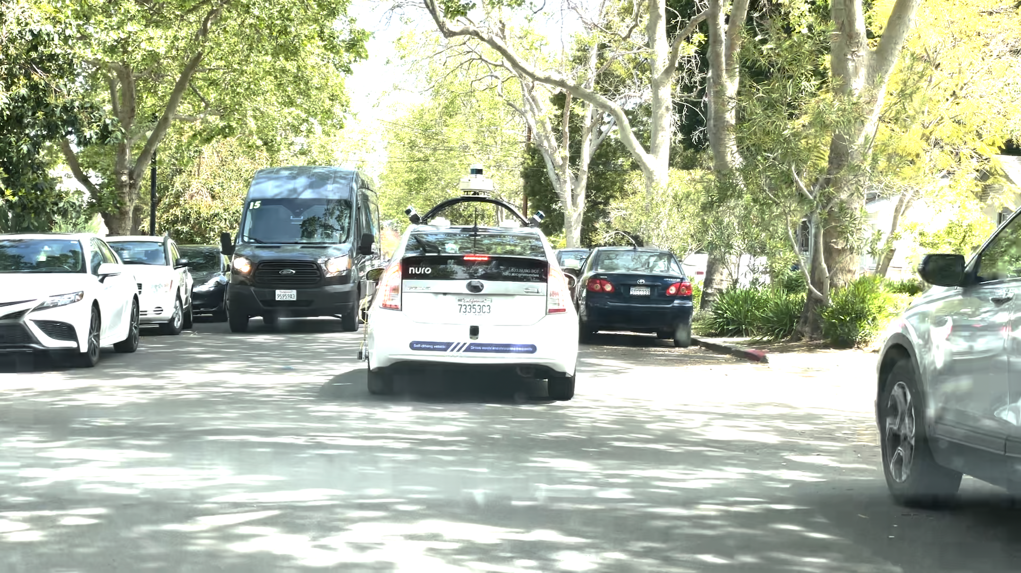 Die umfangreiche Flotte des Lieferroboterherstellers Nuro ist fleißig am Testen. Ein Fahrzeug konnte ich durch enge Straßenzüge in Mountain View beobachten, wo doppelgeparkte Autos und andere Herausforderungen warteten. Man sieht, wie sich das Fahrzeug vorsichtig durch mehrere enge Abschnitte bewegt.